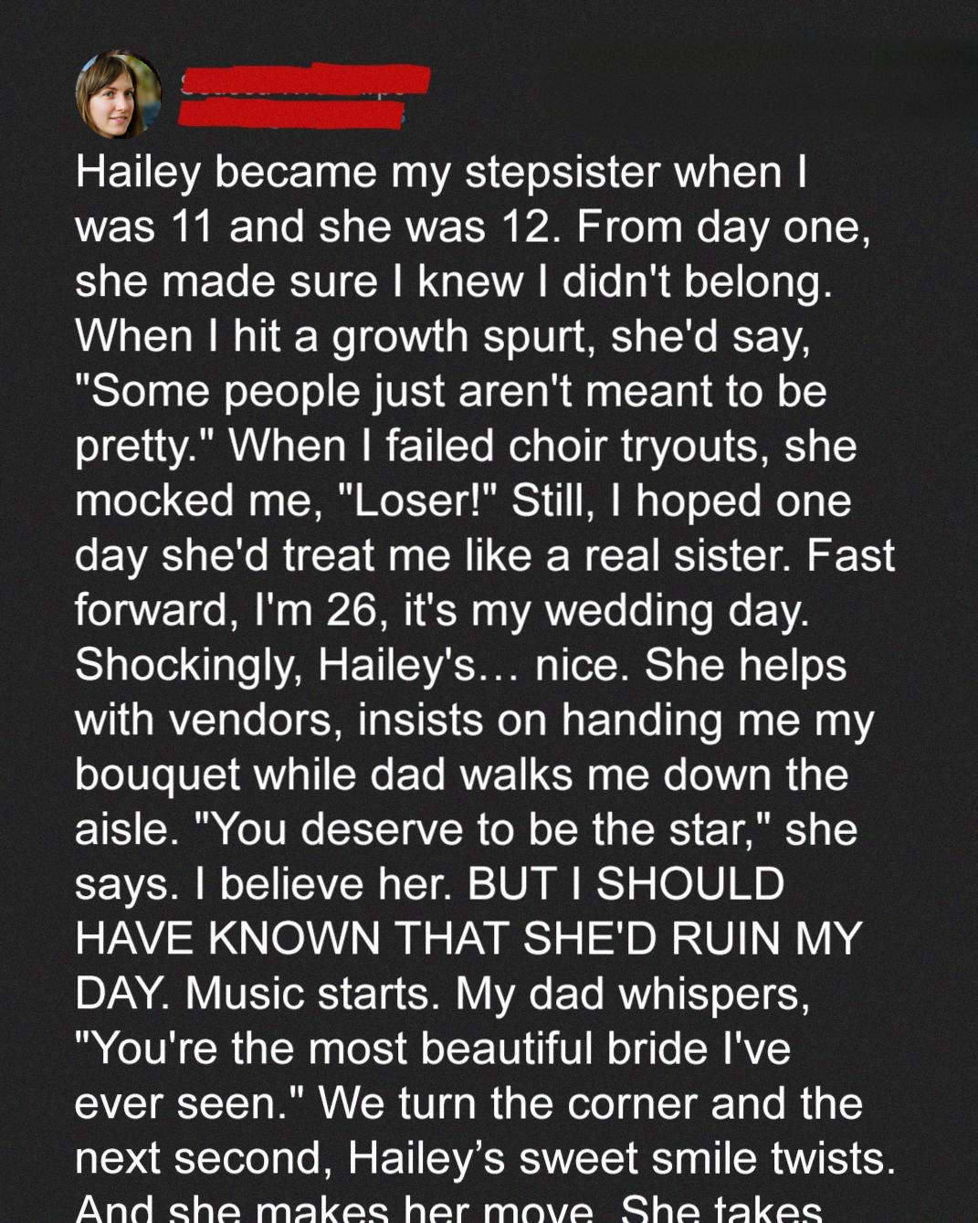 She stopped my processional, and as I slowly walked, Hailey walked closer to the first row. Before I could ask what was wrong, Hailey faced the crowd and announced [“I HAVE SOMETHING TO SHARE WITH EVERYONE. IT’S ABOUT THE BRIDE!”]. I was horrified. How could she do this? What was she about to say? My mind raced, trying to anticipate the damage she was about to inflict. My dad squeezed my hand, his face a mask of confusion and concern. Mark, standing at the altar, looked equally bewildered. All eyes were on Hailey, waiting with bated breath. I wanted the floor to swallow me whole. I wanted to disappear.