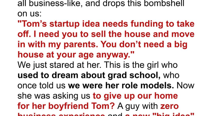 Last Sunday, out of the blue, our granddaughter Ellie shows up at our door, all business-like, and drops this bombshell on us: “Tom’s startup idea needs funding to take off. I need you to sell the house and move in with my parents. You don’t need a big house at your age anyway.” We just stared at her. This is the girl who used to dream about grad school, who once told us we were her role models. Now she was asking us to give up our home for her boyfriend Tom? A guy with zero business experience and a new “big idea” every other week? We tried to reason with her, but Ellie wouldn’t listen. It’s like she was blinded by her love for Tom. So, George and I spent the whole night discussing what to do, and finally came up with a plan to expose the truth. A few days later, George secretly bought a small stake in Tom’s company, just enough to get access to their financial records. What we discovered was absolutely sickening.