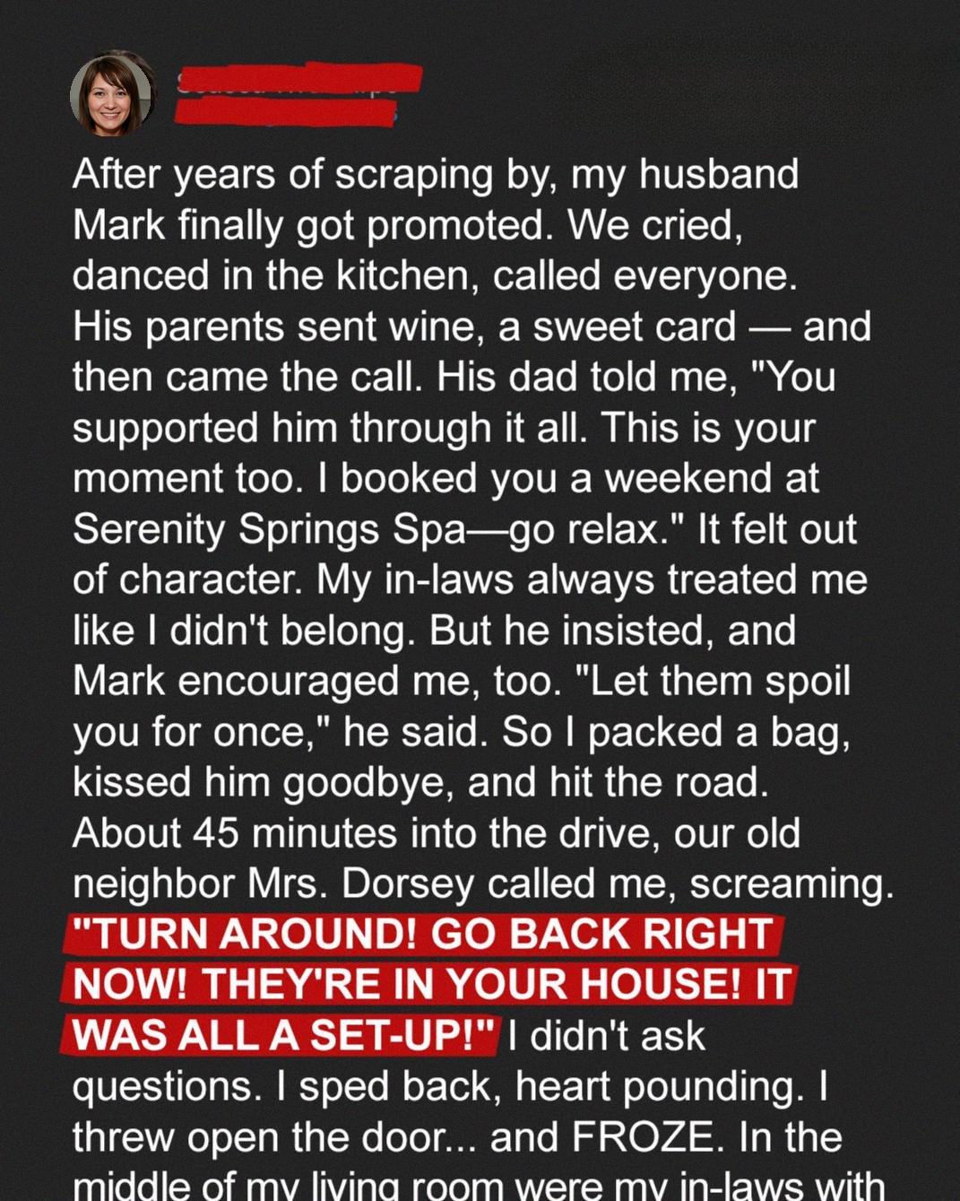 Reluctantly, I agreed. I packed a bag, kissed Mark goodbye, and set off on the road to Serenity Springs. The drive was scenic and relaxing, but I couldn’t shake off this strange feeling that was in the pit of my stomach. I was about 45 minutes into the drive, enjoying the solitude and peaceful scenery, when my phone rang. It was Mrs. Dorsey, our elderly neighbor, and she was screaming. “TURN AROUND! GO BACK RIGHT NOW!” she shrieked into the phone. “THEY’RE IN YOUR HOUSE! IT WAS ALL A SET-UP!” Her words were frantic and filled with terror. I didn’t have time to ask questions. Adrenaline coursed through my veins as I slammed on the brakes, made a U-turn, and sped back towards home, my heart pounding in my chest.