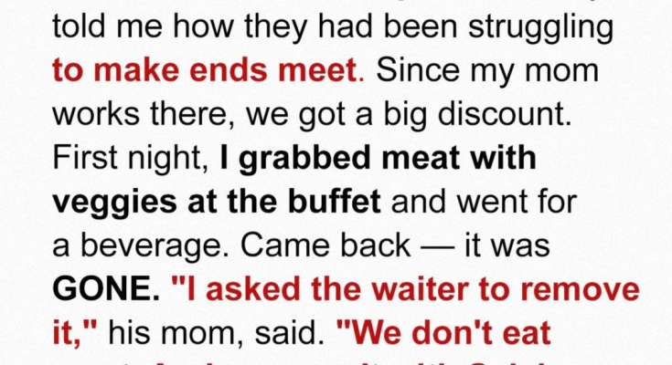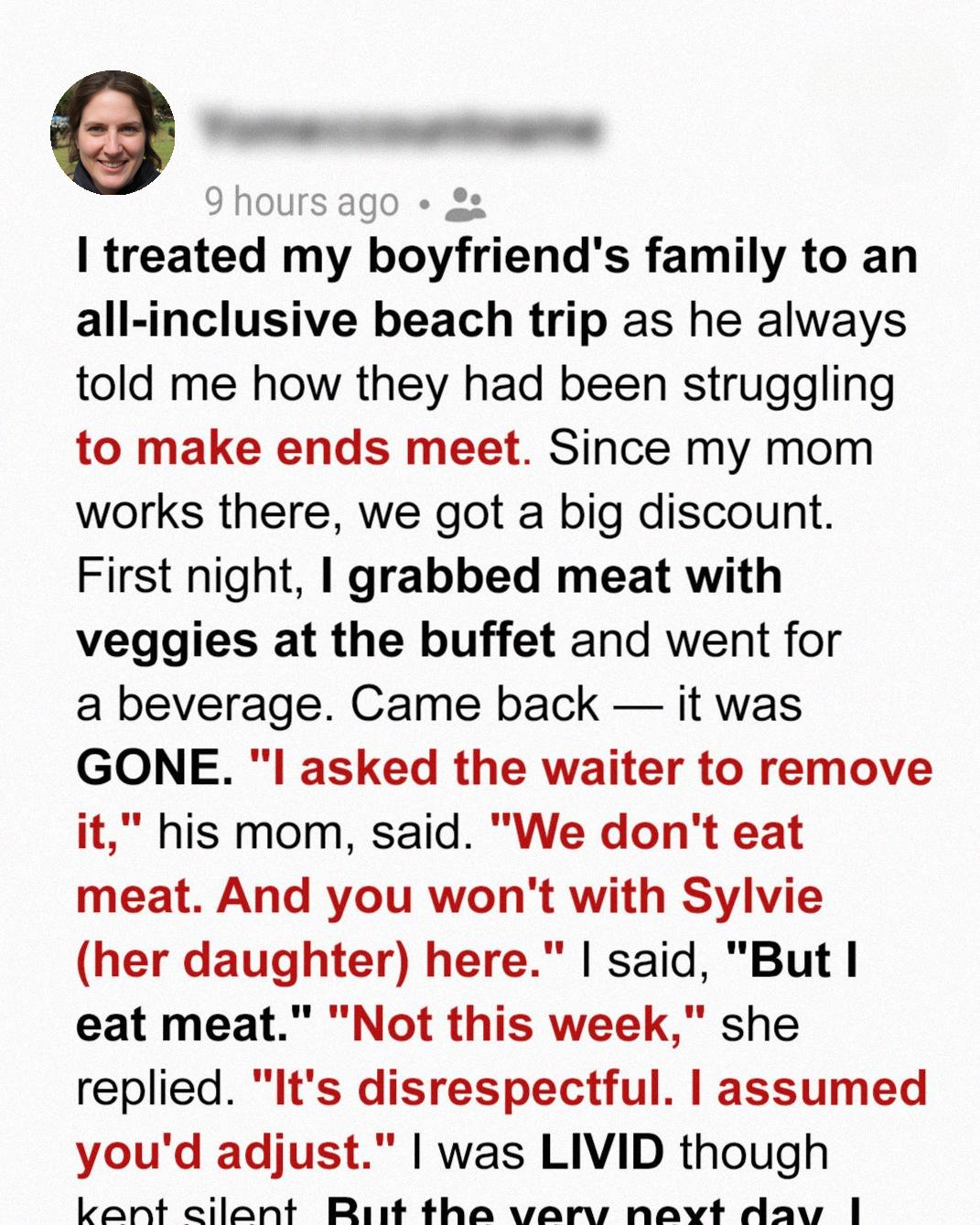 “But… I eat meat,” I repeated, my voice rising in disbelief. “I planned on eating meat on this trip.” His mother’s smile vanished completely. “Not this week,” she stated firmly. “It’s disrespectful to eat meat in front of us, especially Sylvie. I just assumed you would adjust your diet accordingly. It’s the least you can do, considering we are your guests”. My mind was reeling. She [“ASSUMED I WOULD ADJUST MY DIET”]. The audacity of this woman was breathtaking. I had paid for this vacation! How dare she dictate what I could and couldn’t eat?