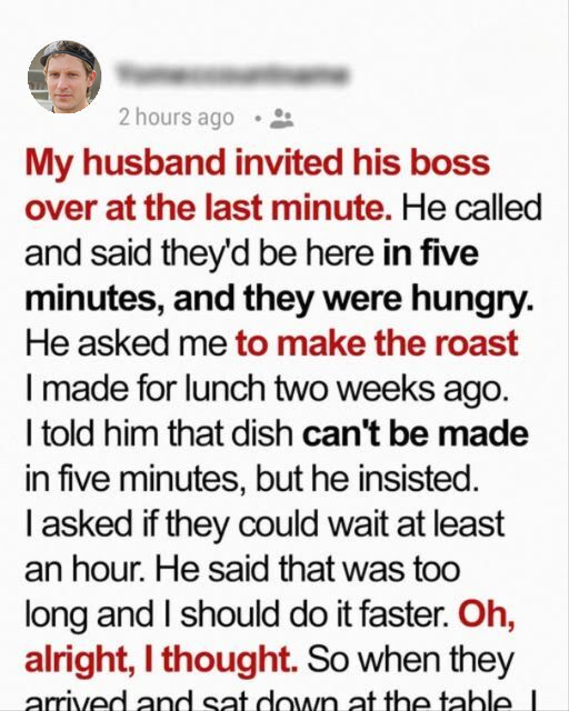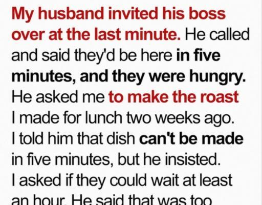 It all started on a seemingly normal Tuesday afternoon. My husband, Mark, called me from work, his voice laced with a strange urgency. “Honey,” he began, “my boss, Mr. Henderson, is coming over…in like, five minutes. And he’s hungry.” My heart skipped a beat. Five minutes? Mr. Henderson? We had never had a boss over before. The house was a mess and [“I was wearing my pajamas”]. But what came next was even more unbelievable. “He’s really craving that roast you made two weeks ago,” Mark continued, as if this was the most reasonable request in the world. That roast! It was a slow-cooked masterpiece, a labor of love that took hours to prepare. I spluttered, “Mark, that takes hours! I can’t just whip it up in five minutes!” His response? An infuriating, “Just hurry, honey. He’s really looking forward to it.” I felt a surge of disbelief wash over me. Was he serious? Did he really expect me to perform a culinary miracle on demand? I managed to stammer out a compromise. “Can they at least wait an hour?” I asked, hoping for a shred of understanding.