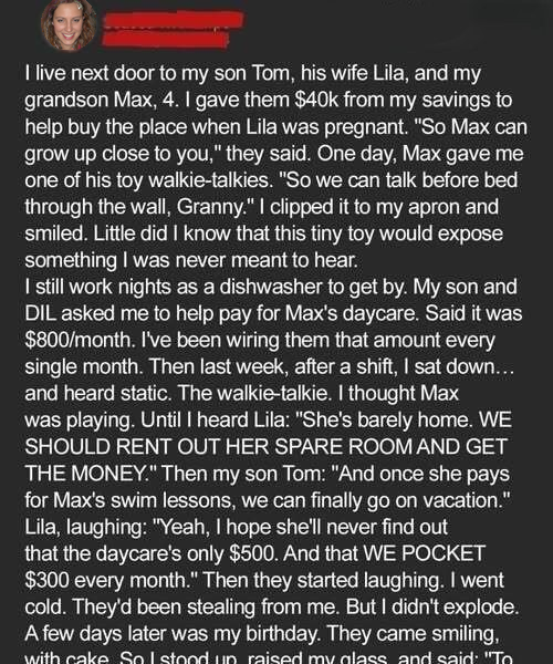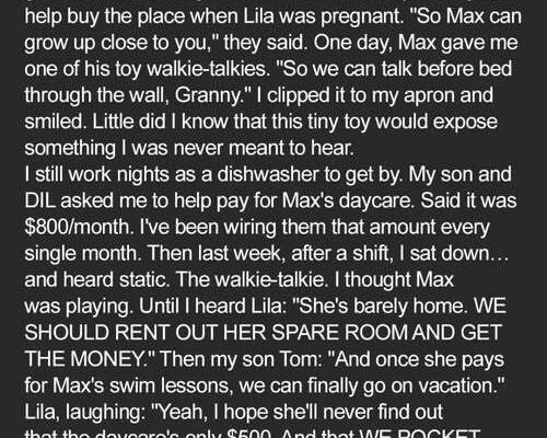 I live next door to my son Tom, his wife Lila, and my grandson Max, who is four years old. When Lila was pregnant, I gave them $40,000 from my savings to help them buy their place. They told me, “So Max can grow up close to you,” and I thought it was a wonderful idea. I wanted to be a part of my grandson’s life, to watch him grow, and to create lasting memories with him. The idea of being just a few steps away from them filled me with so much joy and anticipation. One day, Max gave me one of his toy walkie-talkies. With his big, innocent eyes, he said, “So we can talk before bed through the wall, Granny.” I clipped it to my apron and smiled, cherishing the sweet gesture from my grandson. Little did I know that this tiny toy would expose something I was never meant to hear, a dark secret that would shatter my perception of my son and his wife. I truly believed we were a close-knit family, and I never suspected that they would be capable of such deception. The thought that they would betray my trust, and worse, exploit my love for my grandson, never even crossed my mind.