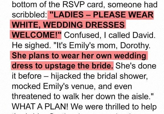 My wife, Linda, and I received an invitation to my old friend David’s wedding. We were thrilled for him and his fiancée, Emily, as they were a wonderful couple. However, as we examined the RSVP card more closely, we noticed something incredibly bizarre scribbled at the bottom. In what appeared to be rushed handwriting, someone had written: “LADIES – PLEASE WEAR WHITE, WEDDING DRESSES WELCOME!” Linda and I exchanged puzzled glances, completely taken aback by this strange request. Was this some kind of unusual theme? A joke gone wrong? We honestly had no idea, so I immediately decided to call David to seek clarification. David answered the phone with a weary sigh, and as soon as I mentioned the strange dress code instruction, he groaned. “It’s Emily’s mom, Dorothy,” he explained with a heavy voice. “She’s planning to wear her own wedding dress to the wedding in an attempt to upstage Emily.” I was absolutely floored. How could a mother do such a thing to her own daughter? David went on to describe a series of increasingly outrageous behaviors Dorothy had exhibited throughout the wedding planning process. She had allegedly [ “HIJACKED EMILY’S BRIDAL SHOWER” ], turning it into a showcase for herself and her accomplishments. She had also relentlessly mocked Emily’s choice of venue, calling it ‘too rustic’ and ‘not elegant enough’ for such an important occasion. And, to top it all off, she had even brazenly threatened to walk Emily down the aisle herself, pushing David’s father aside in the process!