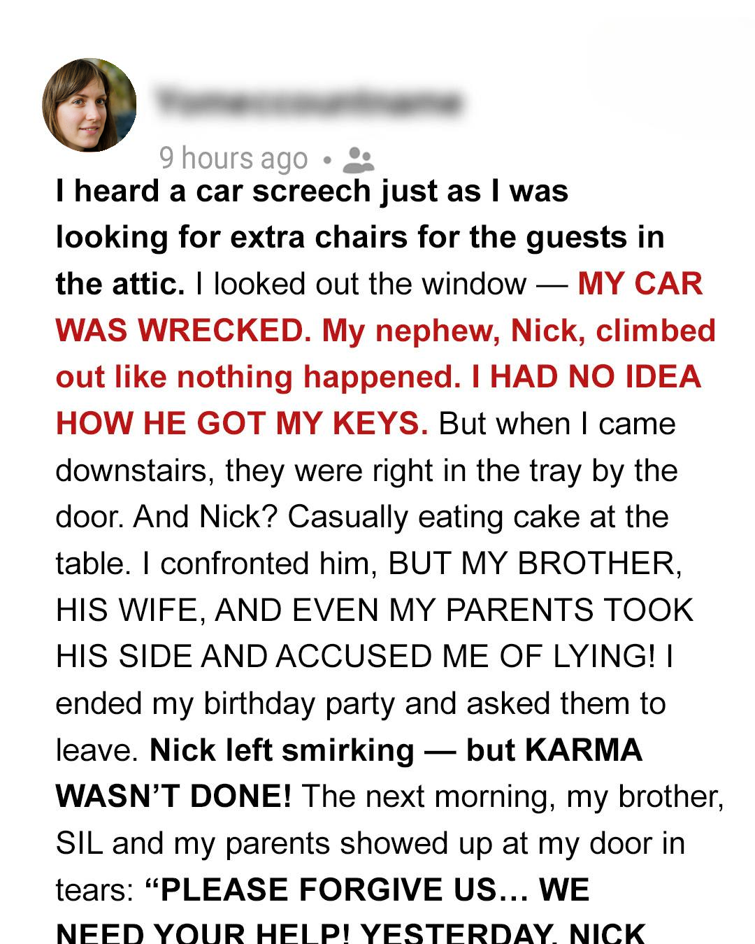 It was my birthday, and I was so excited to have all my family over for a nice celebration. I had spent the entire week preparing, decorating, and baking my favorite cake. As guests started arriving, I realized I was short on chairs. Knowing I had some stored in the attic, I excused myself and headed up there to retrieve them. It was while rummaging through old boxes that I heard a loud, screeching sound that made my blood run cold. Instinctively, I rushed to the nearest window and peered outside. My heart stopped. What I saw made my stomach churn and my hands start to shake uncontrollably. It was **my car**, the one I worked so hard to pay off, the one I babied and kept in pristine condition. It was a mangled mess, the front end smashed against a tree in my front yard. And emerging from the driver’s side, as cool as could be, was my nephew, Nick. He casually climbed out of the wreckage as if he had just parked the car. [ “I WAS IN UTTER SHOCK” ].