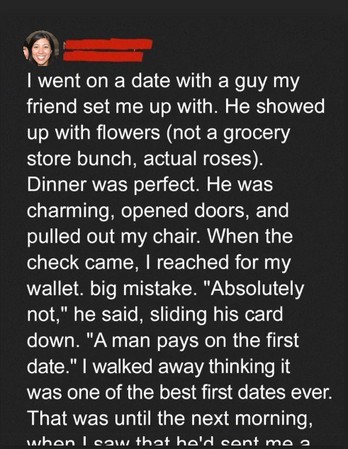 Then came the moment of truth: the check. As any self-respecting, independent woman would do, I reached for my wallet, fully prepared to split the bill. Big mistake. Apparently, Chad had other plans. With a slightly smug grin, he swatted my hand away and declared, “Absolutely not. A man pays on the first date.” Now, I’m all for chivalry, but something about his tone rubbed me the wrong way. It felt…calculated. Nevertheless, I thanked him, and we left the restaurant. The evening ended with a polite hug at my doorstep, and I went inside, feeling cautiously optimistic about the possibility of a second date.