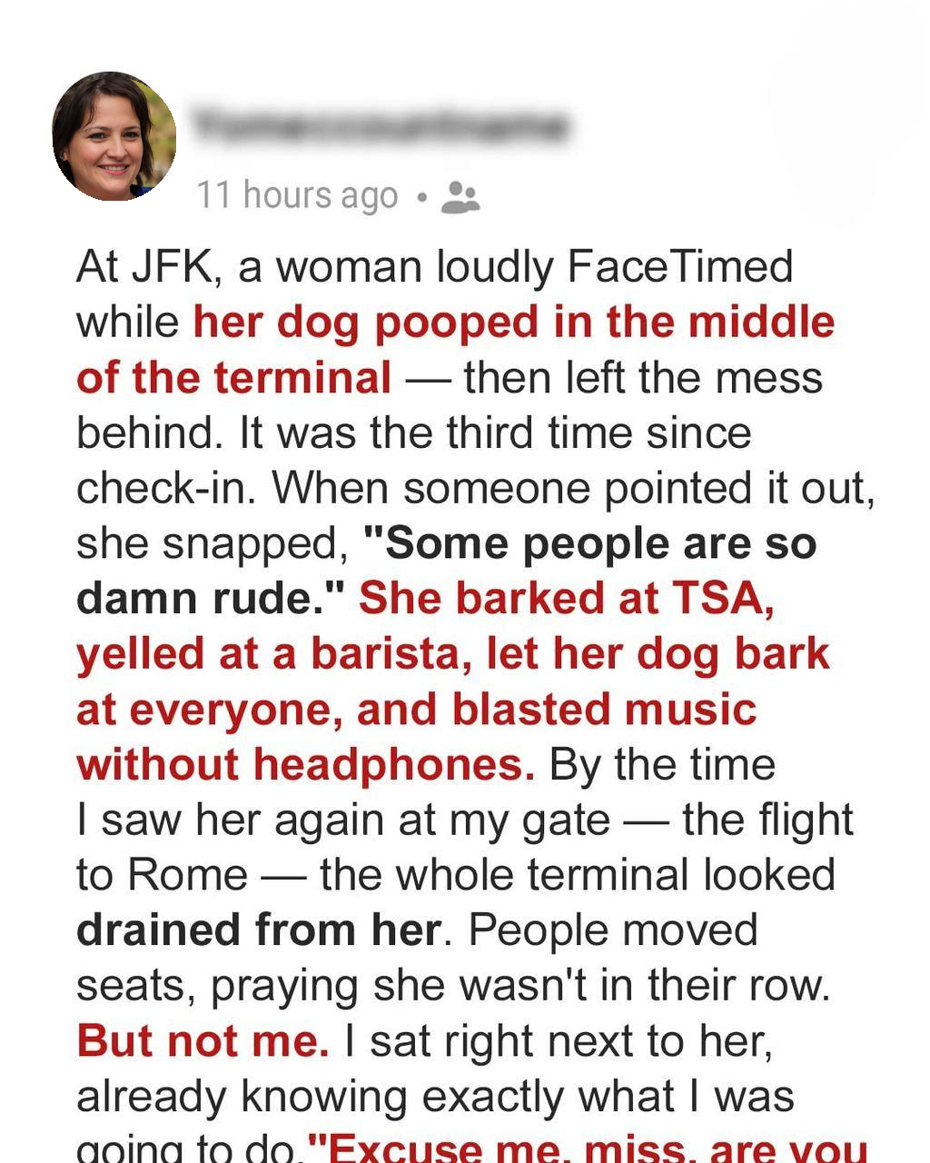 People were actively moving seats, whispering prayers under their breath, desperately hoping that she wouldn’t be seated anywhere near them. I, on the other hand, felt a strange sense of determination wash over me. I knew exactly what I was going to do. Instead of avoiding her like everyone else, I purposefully chose the seat right next to her. As I settled in, I turned to her with a polite smile and said, “Excuse me, miss, are you aware that… [“YOUR DOG LEFT A PILE OF POOP”], and that you left a trail behind you?” This was going to be an interesting flight to Rome.