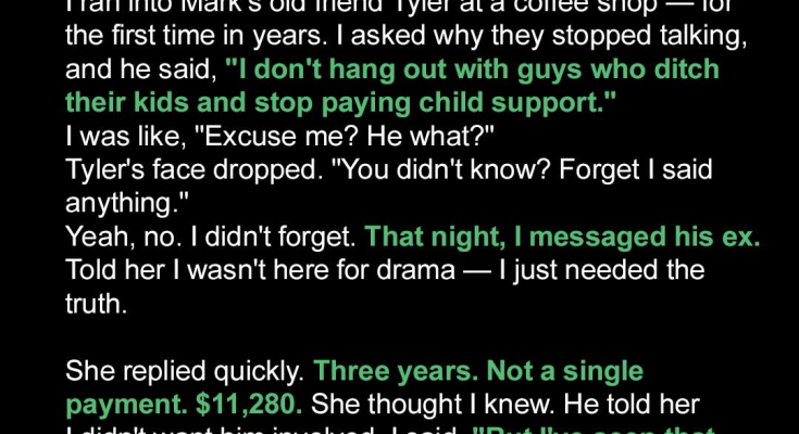 It was just a normal Tuesday when I ran into Tyler, an old friend of my husband, Mark, at our local coffee shop. I hadn’t seen Tyler in years, and after the initial pleasantries, I asked him why he and Mark had drifted apart. I wasn’t prepared for his response. He looked uncomfortable and then said, “I don’t hang out with guys who ditch their kids and stop paying child support.” My jaw practically hit the floor. “Excuse me? He what?” I asked, my voice barely above a whisper. Tyler’s face immediately dropped. He realized he’d said too much. “You didn’t know? Forget I said anything,” he stammered, clearly regretting his words. But there was no forgetting it. The seed of doubt had been planted, and I knew I couldn’t ignore it. That night, I couldn’t sleep. I kept replaying the conversation with Tyler in my head. How could Mark keep something like that from me? Was it even true? I decided I needed to know the truth, no matter how painful it might be. I found Mark’s ex-girlfriend on social media and sent her a message. I told her I wasn’t there for drama, I just needed to understand what was going on. I explained that I had just found out that Mark had stopped paying child support and that I just needed to know the details.