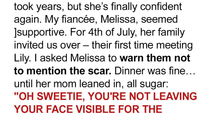 My daughter, Lily, is 16 years old and an absolute ray of sunshine. Unfortunately, when she was younger, she was involved in an accident that left her with a burn scar on her face. It was a long and difficult journey, filled with countless doctor’s appointments and emotional hurdles, but she has finally reached a point where she feels confident and comfortable in her own skin. I am incredibly proud of the strength and resilience she has shown throughout it all. I recently got engaged to my fiancée, Melissa, who I love very much. She has always seemed incredibly supportive of Lily and understanding of the challenges she has faced. I truly believed that Melissa would be a wonderful addition to our family and that she would treat Lily with the love and respect she deserves. However, recent events have made me question everything I thought I knew. For the 4th of July, Melissa’s family invited us over for a barbecue. It was supposed to be a casual and fun get-together, and I was excited for Lily to finally meet them. This would be the first time that she would be meeting Melissa’s entire extended family and I asked Melissa beforehand to please warn her family not to mention the scar. I wanted to avoid any awkward or hurtful situations for Lily, as I knew that unsolicited comments or questions could be incredibly triggering for her. Melissa assured me that she would take care of it, and I trusted that she would.