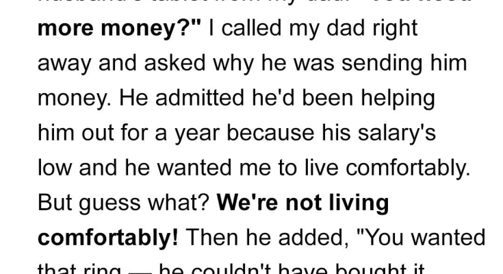 I’m still reeling from what I uncovered last night. It all started so innocently. My husband, Mark, had left his tablet on the kitchen counter, something he rarely does. I wasn’t snooping, I swear! I just happened to glance at the screen, and there it was – a notification from his messaging app. The sender? My own father. The message? [ “You need more money?” ] My heart skipped a beat. Why would my dad be sending my husband money? A million questions flooded my mind, each more disturbing than the last. Was Mark in some kind of trouble? Was my dad secretly supporting him without my knowledge? The sheer audacity of it all made my blood run cold. I couldn’t wait. I immediately called my dad, my voice trembling with a mixture of anxiety and suspicion. I confronted him directly, blurting out what I had seen. There was a long, heavy silence on the other end of the line, and then he confessed. He admitted that he had been supplementing Mark’s income for the past year. His reasoning? He knew Mark’s salary was significantly lower than mine, and he wanted to ensure that I could maintain a certain lifestyle. He wanted me to be happy and comfortable, oblivious to any financial strain. [ “I wanted you to be happy.” ]