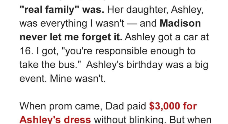 When my dad remarried, I was twelve, and my life took a turn I never saw coming. Madison, his new wife, wasn’t exactly the ‘evil stepmother’ you read about in fairy tales, but she wasn’t far off. From day one, she made it abundantly clear that Ashley, her daughter, was the priority. Ashley was everything I wasn’t – popular, bubbly, and, according to Madison, ‘effortlessly graceful.’ I, on the other hand, was apparently clumsy, awkward, and always in the way. The subtle digs started almost immediately, and over the years, they escalated into blatant favoritism that left me feeling like an unwanted guest in my own home. It was a constant barrage of comparisons and subtle reminders that I simply didn’t measure up. I tried to ignore it, to focus on school and my friends, but it was hard to escape the feeling that I was living in Ashley’s shadow. My dad, bless his heart, seemed oblivious to the dynamics at play. Or perhaps he simply didn’t want to rock the boat. Either way, he remained silent, leaving me to navigate the treacherous waters of my new family life alone. [“LITTLE DID I KNOW, MY QUIET SUFFERING WOULD LEAD TO THE MOST SATISFYING REVENGE.” ]
