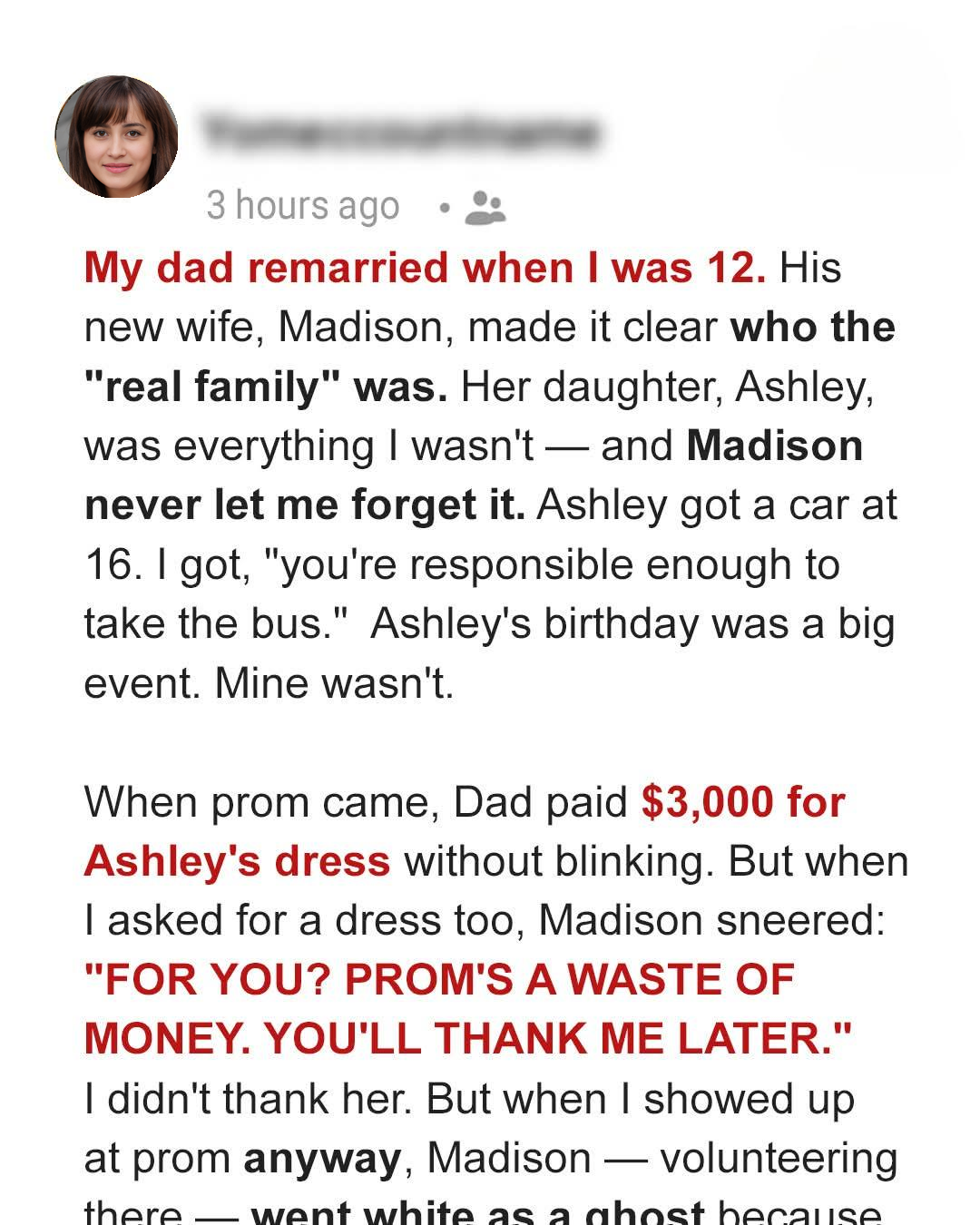 When I finally mustered the courage to ask my dad about a prom dress, I was met with a response that shattered my hopes and confirmed my worst fears. He said he’d talk to Madison. A few days later, Madison called me into the kitchen, a smug look on her face. She told me that they had decided that prom was a ‘waste of money’ and that I would ‘thank them later’ for saving me the expense. She said that I wasn’t ‘responsible enough’ to handle the pressure of such an event and that I should focus on my studies instead. [“HER EXACT WORDS WERE LIKE A KNIFE TO MY HEART.”] I felt like I had been punched in the gut. All my hopes and dreams for prom were crushed in an instant. I couldn’t believe that she could be so cruel, so dismissive of my feelings. I stormed off to my room, tears streaming down my face, feeling utterly defeated and worthless. The injustice of it all was overwhelming. Why did Ashley get everything she wanted, while I was constantly denied even the simplest of pleasures? It wasn’t fair, and I couldn’t understand why my own father couldn’t see the disparity in treatment.