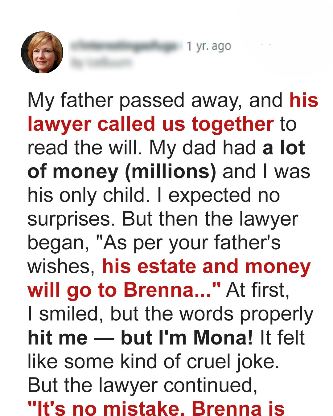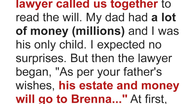 We gathered at the lawyer’s office a week after the funeral. It was a somber affair, with all the usual formalities. The lawyer, a portly man with a perpetually furrowed brow, cleared his throat and began to read the will. Everything seemed to be going as expected until he reached the crucial part about the inheritance. He read, “As per your father’s wishes, his entire estate, including all assets, properties, and monetary holdings, will be transferred to one Brenna…” I initially smiled, assuming that Brenna was some sort of charity that my father supported. But then the words properly hit me — but I’m Mona! It felt like some kind of cruel joke, a bizarre twist in a movie plot. But the lawyer continued, “It’s no mistake. Brenna is…”.