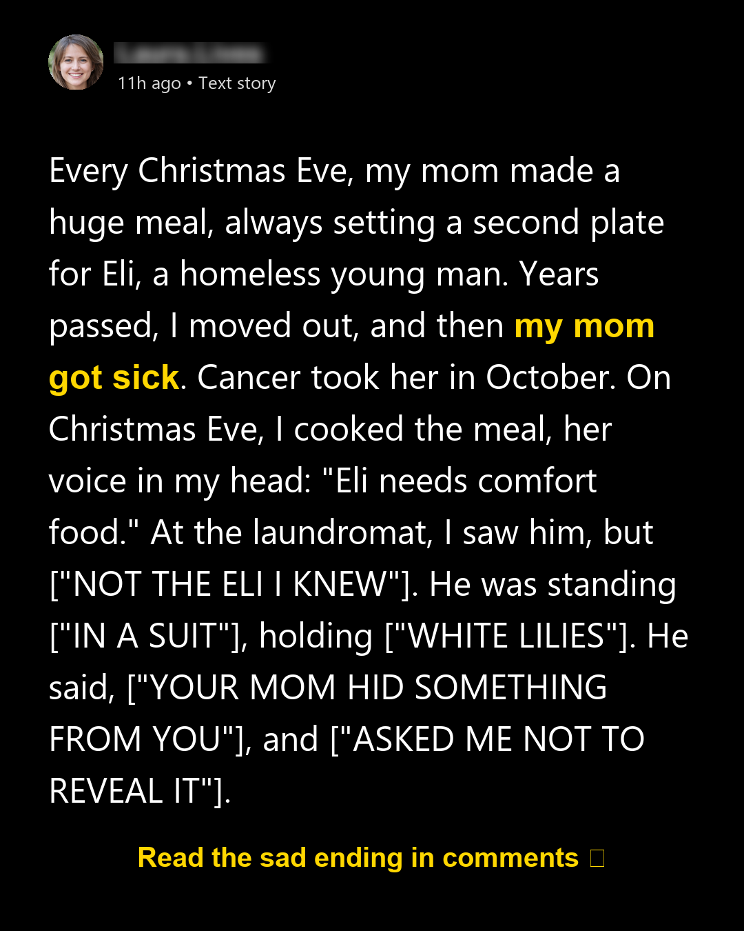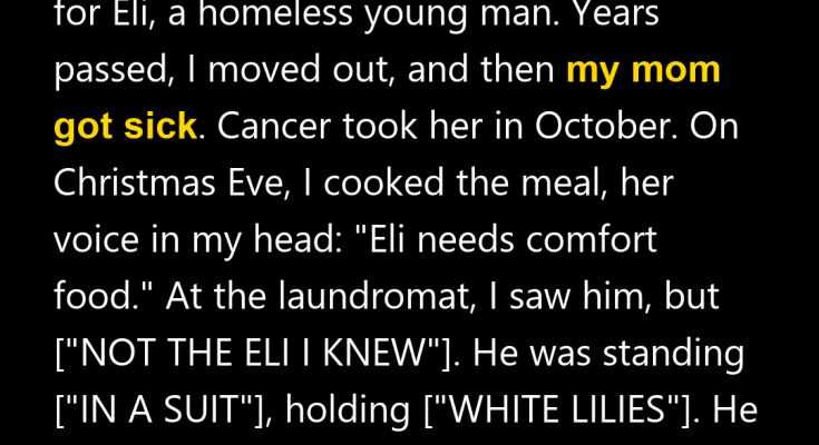 Every Christmas Eve, my mom prepared a large meal. Honey-glazed ham, mashed potatoes, green beans with bacon, and a pan of cornbread that filled the apartment with a sense of comfort. And however complicated our lives were, she always **set aside a second plate**. It was for a homeless young man named Eli, who always slept at the local laundromat. He always occupied the same corner, wrapped in a thin blanket. My mom never acted as if he were invisible. She showed she cared about him every Christmas. As a teen, I rolled my eyes the way teens do when they don’t grasp kindness that doesn’t directly benefit them. Mom discovered that he had lost his family. From then on, she started giving him more than meals. A pair of gloves. A heavy hoodie. A grocery store gift card. Once, she even offered to find him a room. “I can’t,” he said. “I don’t want to be a burden.” “Okay,” Mom said gently. “But dinner still stands.” Years went by. I moved out. I found work. I dated, broke up, tried again. Then **my mom got sick**. Cancer showed no regard for who someone was. She lasted a year. A brutal, ugly year that taught me grief can begin before someone is gone, when Christmas lights feel wrong and cheerful songs seem dishonest. She died in October. By December, I was functioning, not living. On Christmas Eve, I stood in my kitchen looking at my mom’s old roasting pan. Then her voice appeared in my head — soft but firm. “Eli needs some comfort food for Christmas. It’s our tradition.” So the cooking happened. The wrapping went as she had always done it. At the laundromat, my hands trembled. I moved toward his corner and froze. Eli was there, but not the Eli I had known. He wasn’t curled beneath a blanket. He wasn’t stooped as if trying to take up less room. He was standing, in a suit. His hair was neatly trimmed. His beard was gone. He held a bouquet of white lilies. When he saw me, his eyes filled immediately. “Hi,” he said, voice rough. “You came.”