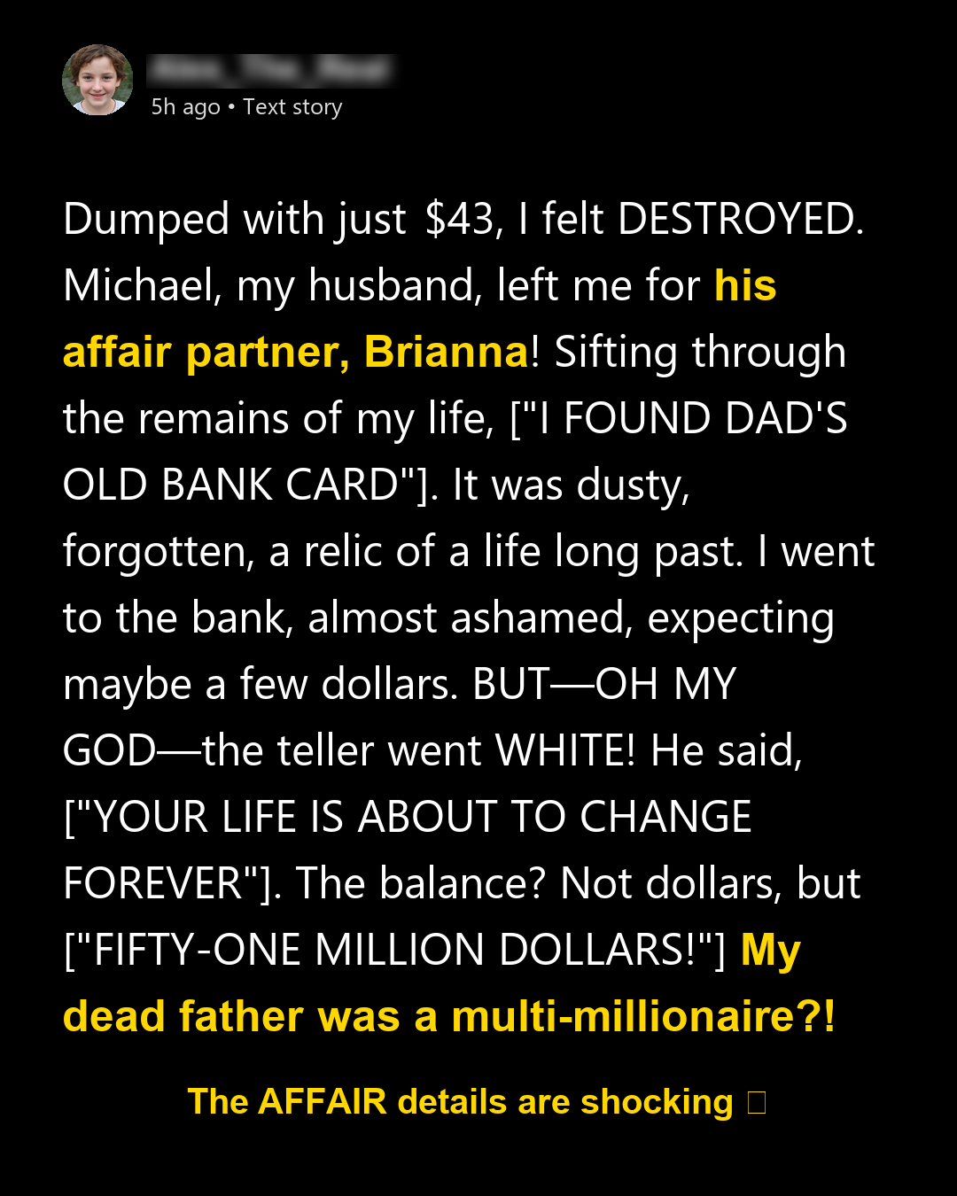 Mr. Collins revealed that my father wasn’t a maintenance supervisor at all. He was a **covert operative for the CIA**, involved in top-secret missions. The money in the account was untraceable funds earned during his time in service, meant to be a safety net for me. But the most shocking part? Michael, my husband, wasn’t just a cheating spouse; he had been actively trying to bankrupt me on orders from **a rival intelligence agency**, who wanted to access my father’s hidden assets. They knew about the card all along.