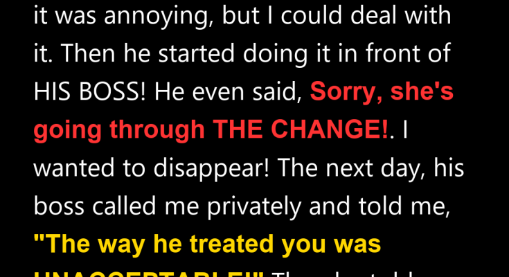At one point during the dinner, I stood up to adjust the thermostat. It was then that he chuckled and casually announced, “Sorry about that. She’s going through THE CHANGE. Menopause. Temperature issues.” I wanted the floor to OPEN UP and swallow me whole. His boss simply WATCHED. The rest of the night was a blur. I cleared plates, skipped dessert, and listened to my husband brag and boast as if I weren’t even there. After his boss left, my husband was GLOWING with pride. “See?” he said. “NAILED IT. Promotion’s finally happening.”