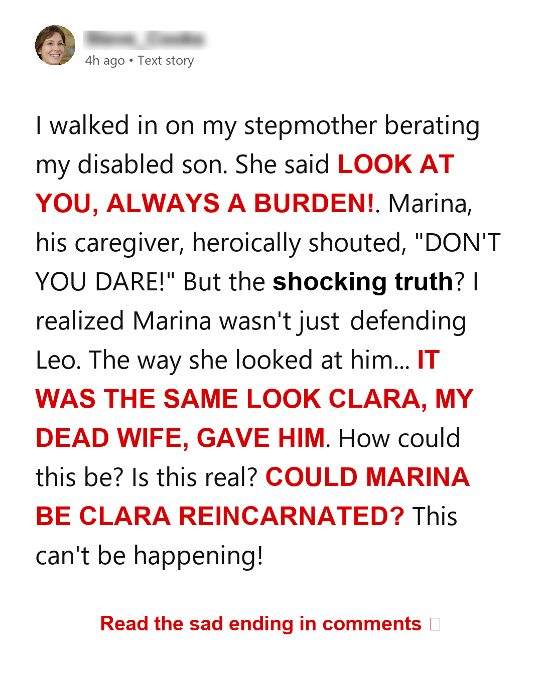 But as he watched Marina comforting his son, the chilling realization hit him like a tidal wave: The way Marina looked at Leo…it was the EXACT SAME WAY Clara, his dead wife, used to look at him. The gentle touch, the unconditional love… [“IT WAS UNMISTAKABLE”]. Could it be possible? [“COULD MARINA BE CLARA, REINCARNATED TO PROTECT THEIR SON?”]