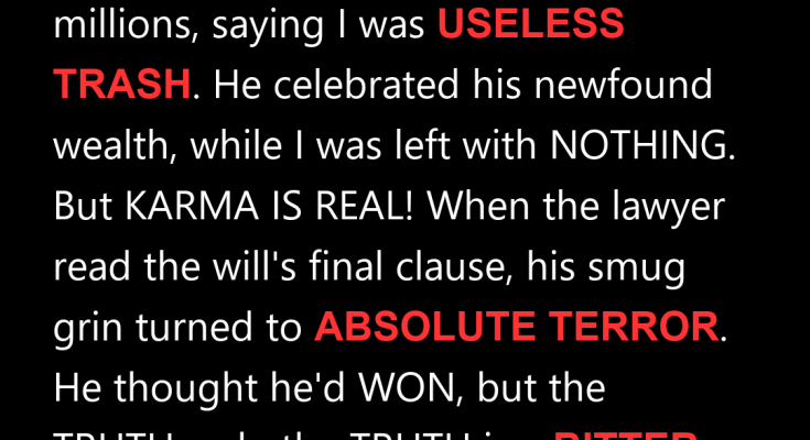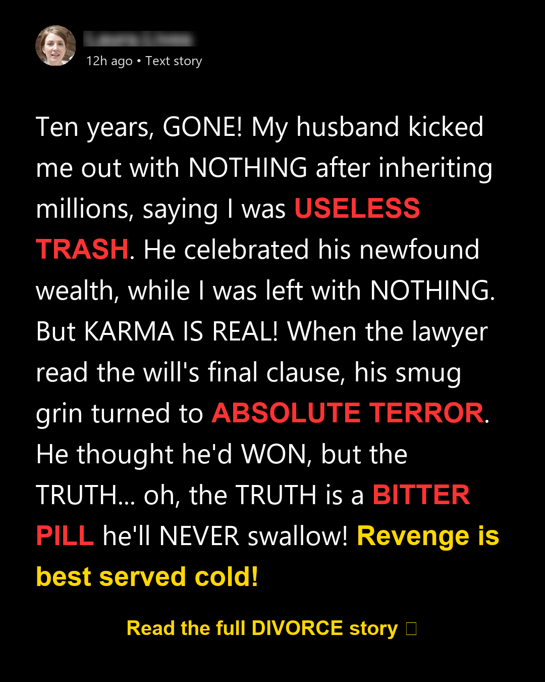 At the reading of the will, Curtis was smug, convinced he’d won. The lawyer droned on, detailing bequests to charities and distant relatives—mere crumbs compared to the vast fortune Curtis believed was his. Then came the final clause, specifically addressing the inheritance. It stipulated that Curtis would inherit absolutely nothing, if he divorced his wife within one year of Arthur’s death. Furthermore it stated that, should the aforementioned divorce occur, the ENTIRE fortune would be transferred to *me*. The look on Curtis’s face was priceless. Arthur, knowing his son’s character, had ensured that the woman who truly cared for him—his daughter-in-law—would be rewarded, and his selfish son punished. However, the biggest twist? I knew about this clause the whole time! Arthur told me on his deathbed, and WE PLANNED THIS TOGETHER!