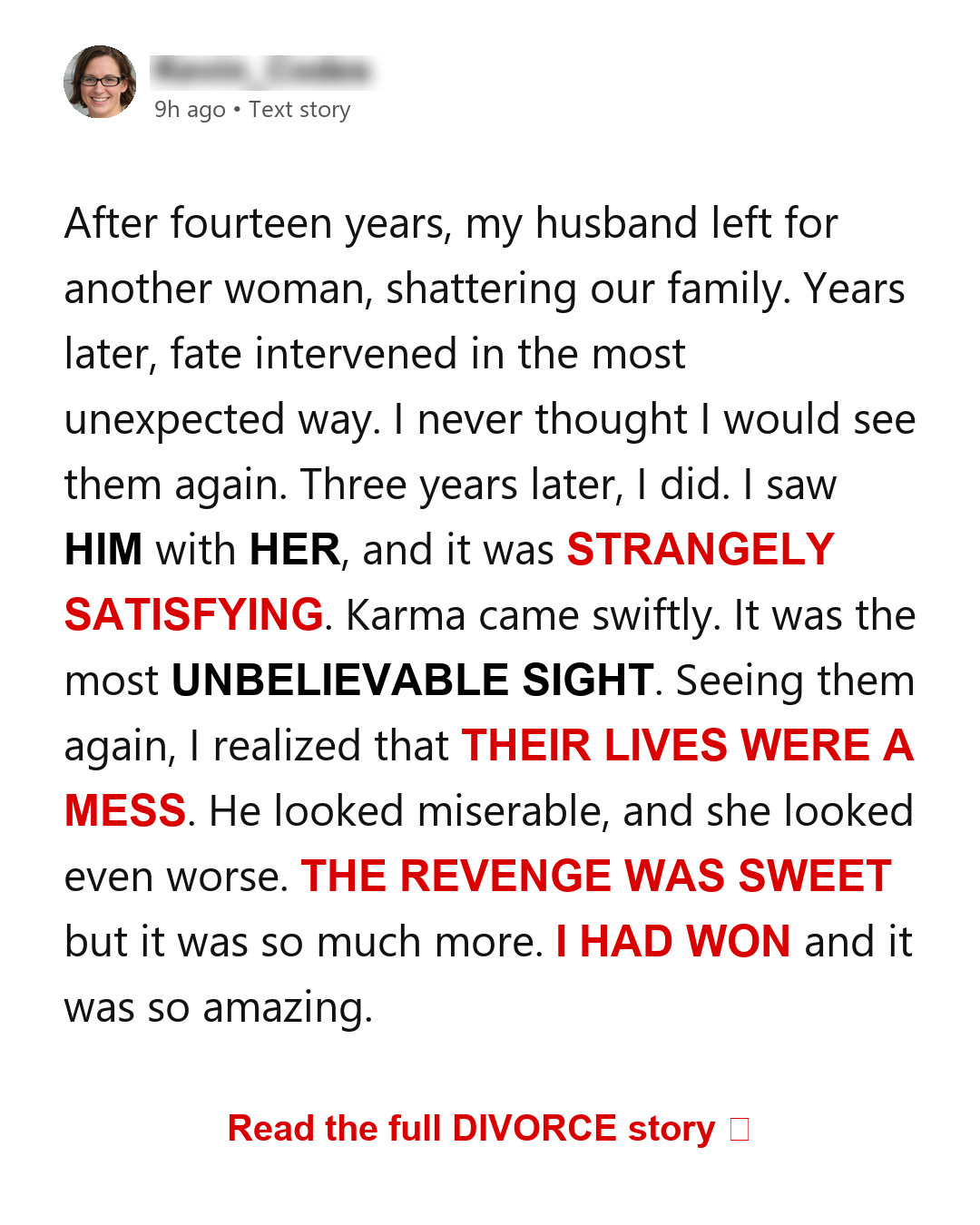 Then one afternoon, walking home with groceries, I saw them. Stan and Miranda. My heart tightened. But as I got closer, it became obvious that karma had been working. He was hunched over, and she was in an old beat-up car. The sight made me feel so strange.