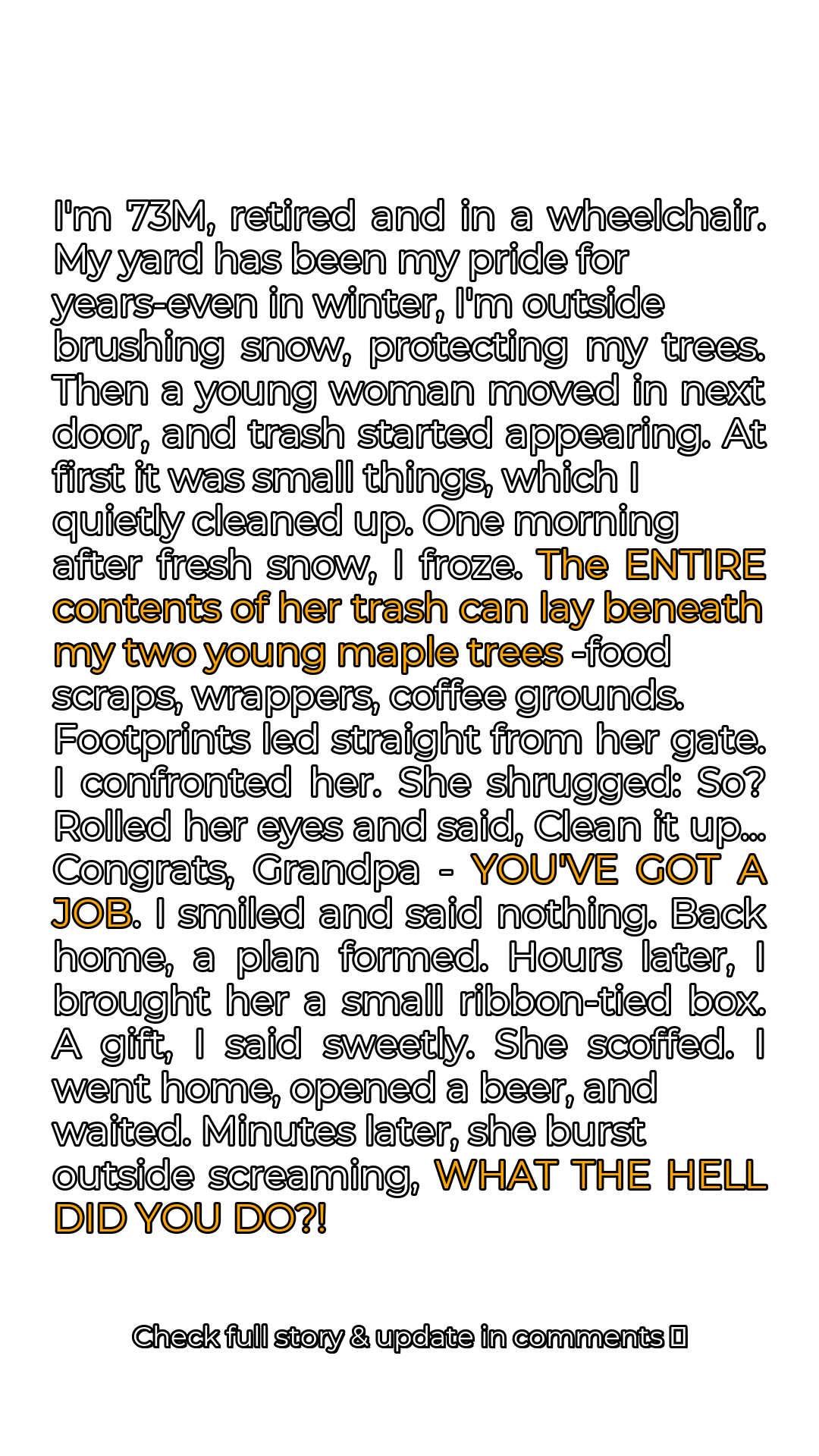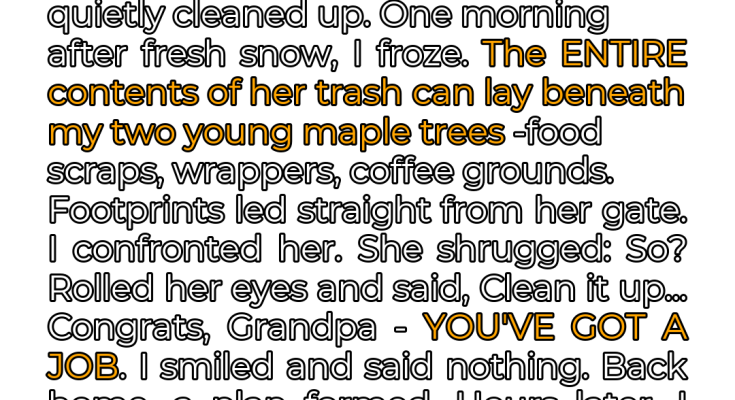 I’ve always taken immense pride in my yard. Even after retirement, even confined to a wheelchair, it was my escape, my hobby, my little piece of paradise. I’m 73 years old now, and maintaining my yard gave me purpose. The trees, especially, were my pride and joy. I babied them, protected them, and made sure they thrived. That’s why I felt so personally violated when my new neighbor began treating my property like a garbage dump. It started subtly, almost innocently. A stray wrapper here, a discarded plastic bottle there. I initially dismissed it as carelessness, the thoughtlessness of youth. Being the kind of man I am, I just quietly cleaned it up, hoping she would eventually get the message. But it escalated, quickly and dramatically. The small acts of littering morphed into a blatant disregard for my property and my feelings. The audacity of her actions left me stunned, almost speechless. I remember the morning so vividly – the crisp winter air, the freshly fallen snow, and then, the horrifying sight that greeted me.