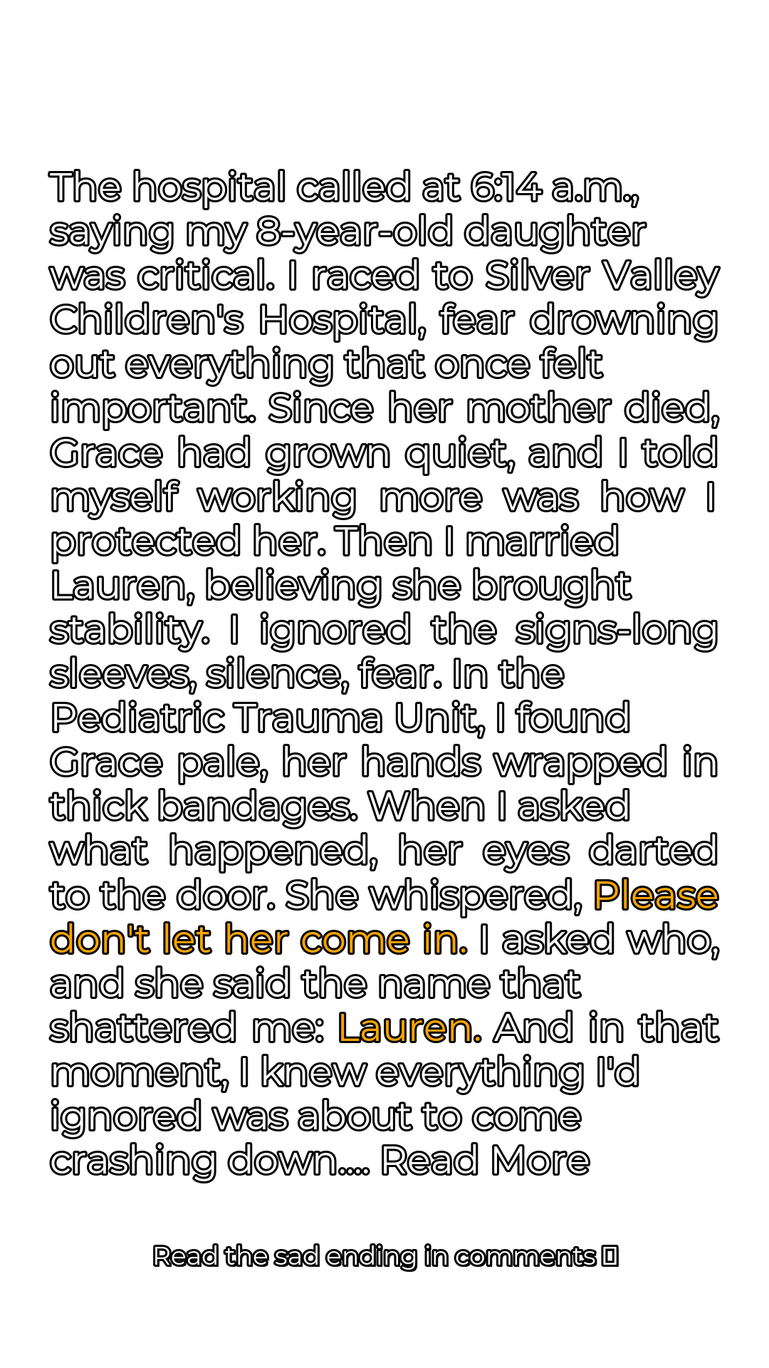 My blood ran cold. “Who, baby? Who shouldn’t come in?” I pressed, my voice barely a whisper. Her eyes locked with mine, and in that moment, I saw the truth reflected in their depths – a truth so horrifying that it threatened to shatter me completely. The silence stretched, thick and suffocating, broken only by the rhythmic beeping of the heart monitor. Finally, she spoke, her voice trembling as she uttered the name that would forever haunt my dreams: “Lauren.”