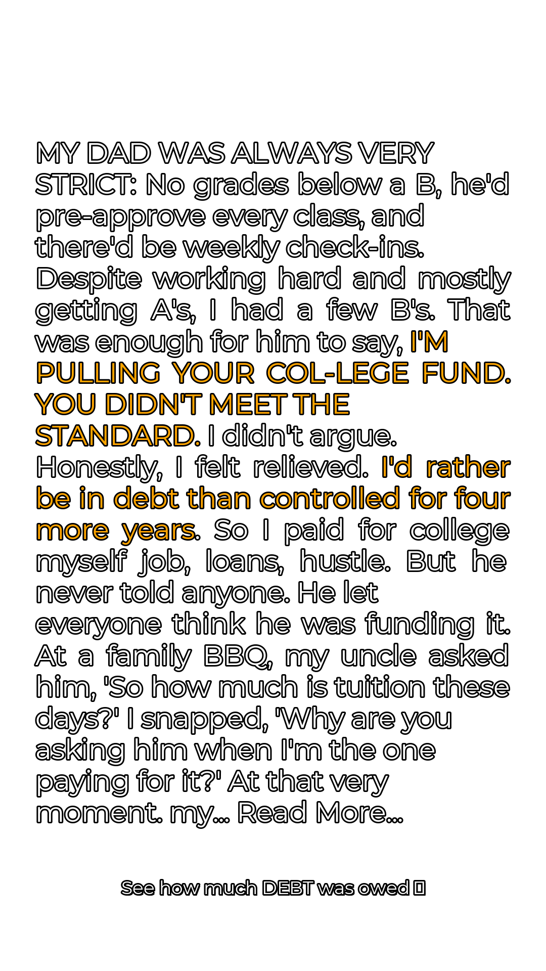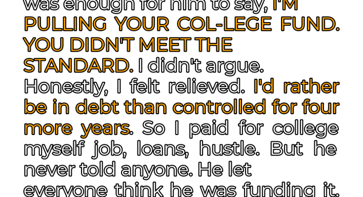 My dad was always a stickler for the rules. It wasn’t just about curfews or chores; it was about every single aspect of my academic life. No grades below a B were tolerated, he pre-approved every single class I took, and there were weekly check-ins where he’d grill me about my progress. It felt less like a father-daughter relationship and more like a performance review. Despite pouring my heart and soul into my studies and managing to mostly snag A’s, a few B’s inevitably slipped through the cracks. To him, that was a sign of failure. It was never enough. I remember the day he delivered the blow. He sat me down in his office, the air thick with disapproval, and calmly stated, “I’m pulling your college fund. You didn’t meet the standard.” The words hung in the air, heavy and final. I didn’t argue. Part of me was devastated, but another part was strangely relieved. The crushing weight of his expectations had become unbearable.