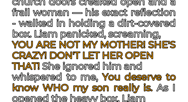 As I approached the altar, a sudden creak echoed through the church. The heavy wooden doors at the back swung open, revealing a figure that sent a shiver down my spine. It was a woman, frail and worn, but with Liam’s eyes. Her face was etched with a lifetime of sorrow, and she clutched a dirt-covered box in her trembling hands. A wave of unease washed over me, a premonition of something terrible about to unfold.
