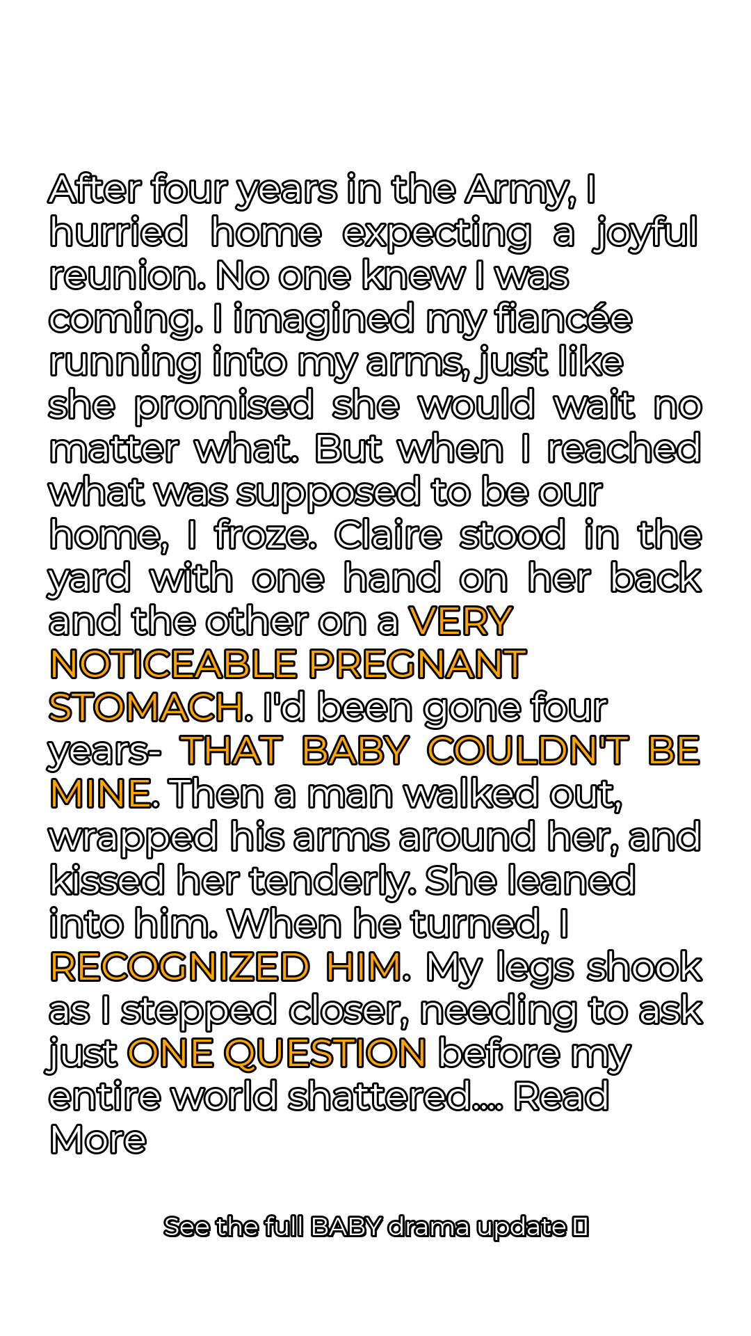 The anticipation had been building for months, years even. Four long years in the Army, each day an eternity away from Claire. I clung to her letters, her promises, her unwavering vow to wait for me, no matter what. Finally, my tour was over. I was coming home, a surprise visit no one expected. I pictured the joyful reunion, Claire running into my arms, tears of happiness streaming down her face. It was the dream that kept me going through the darkest days. I arrived in our town, the familiar streets strangely foreign after so long. Excitement mixed with a nervous energy propelled me forward. Each step brought me closer to our house, to Claire. As I rounded the corner, the scene unfolded before me like a twisted, surreal painting. Claire stood in the yard, her silhouette unmistakable, but something was terribly wrong. Her hand rested on her back, and the other cradled a very noticeable pregnant stomach. My heart lurched, a cold wave washing over me. Four years. It couldn’t be. It simply couldn’t be mine.