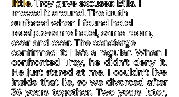 I couldn’t stay. I couldn’t live inside that lie, breathe the same air as a man who had so callously disregarded our vows. After thirty-six years, we divorced. The process was agonizing, a dismantling of a life we had painstakingly built. Two years passed. I started to rebuild my life, piece by piece. Then, the phone call came. Troy was gone. A sudden heart attack, they said. Just like that, he was gone.
