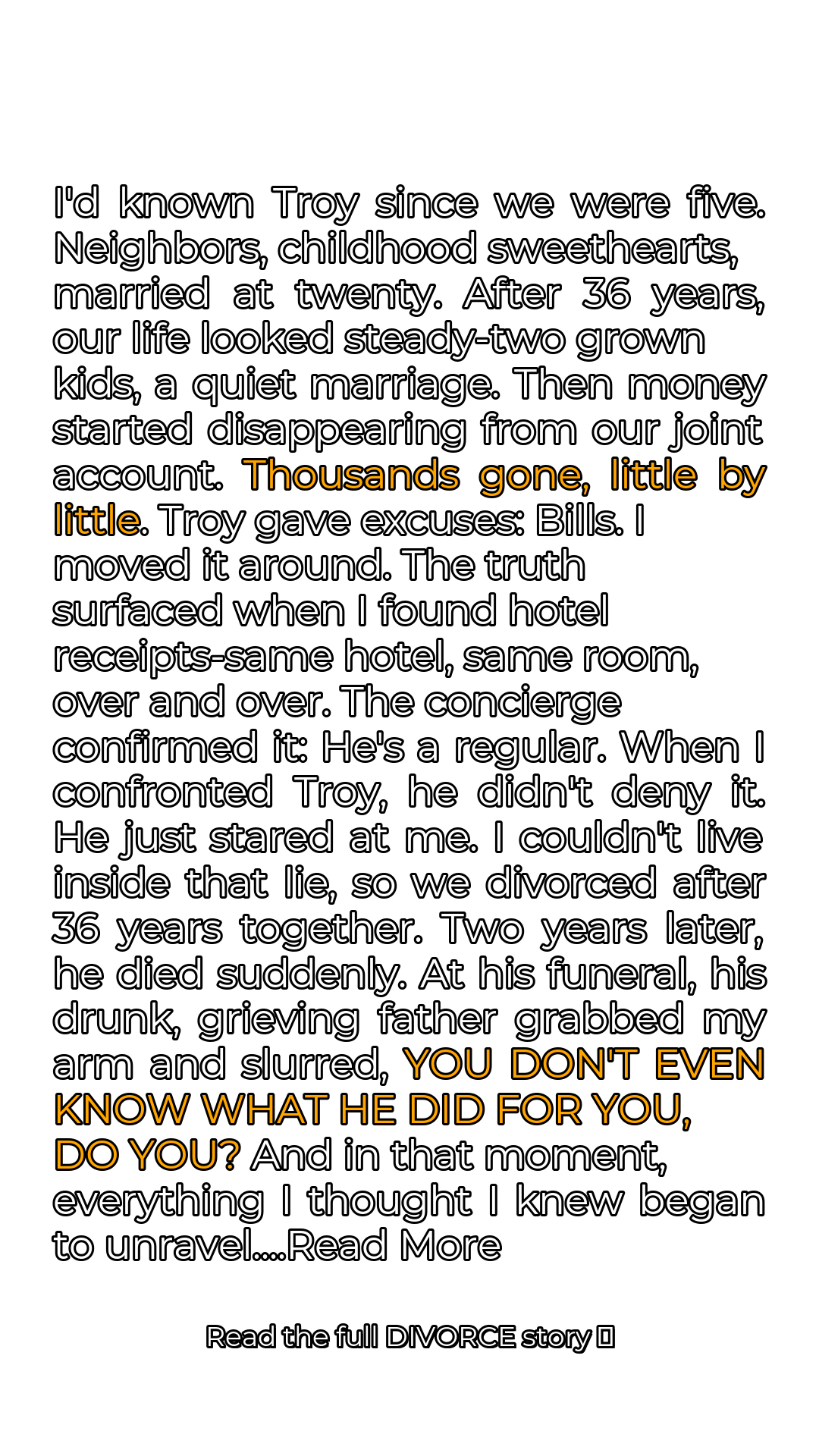 At his funeral, amidst the forced condolences and hollow platitudes, his father, drunk with grief, grabbed my arm. His eyes were bloodshot, his voice thick with sorrow and alcohol. He leaned in close, his breath reeking of whiskey, and slurred, **”YOU DON’T EVEN KNOW WHAT HE DID FOR YOU, DO YOU?”** The words hung in the air, heavy with unspoken meaning. What did he mean? What secret had Troy taken to his grave? What other lies had he concealed beneath the facade of our perfect marriage? The sickening realization washed over me: [ “I NEVER TRULY KNEW HIM AT ALL” ].