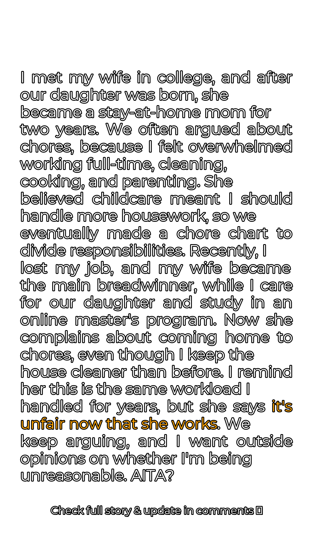 The arguments escalated, becoming more frequent and more heated. I felt like I was trapped in a never-ending cycle of accusations and recriminations. I tried to explain that I was doing my best, that I was juggling childcare, housework, and my studies, but my words seemed to fall on deaf ears. The resentment I had felt years ago began to resurface, stronger than ever. Was I really in the wrong here, or was my wife being unreasonable?