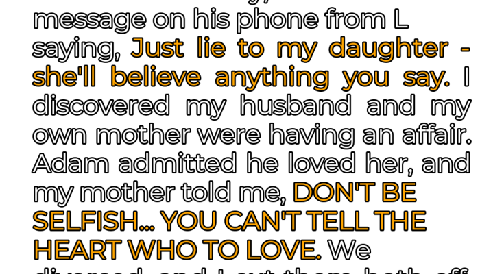 Then one day, while Adam was in the shower, I noticed a message pop up on his phone. Curiosity got the better of me, and I couldn’t resist taking a peek. What I saw next would forever alter the course of my life. The message was from someone saved as “L,” and the words sent a shiver down my spine: [ “JUST LIE TO MY DAUGHTER – SHE’LL BELIEVE ANYTHING YOU SAY” ]. A wave of nausea washed over me as I instantly recognized the handwriting. The sender was none other than my own mother.