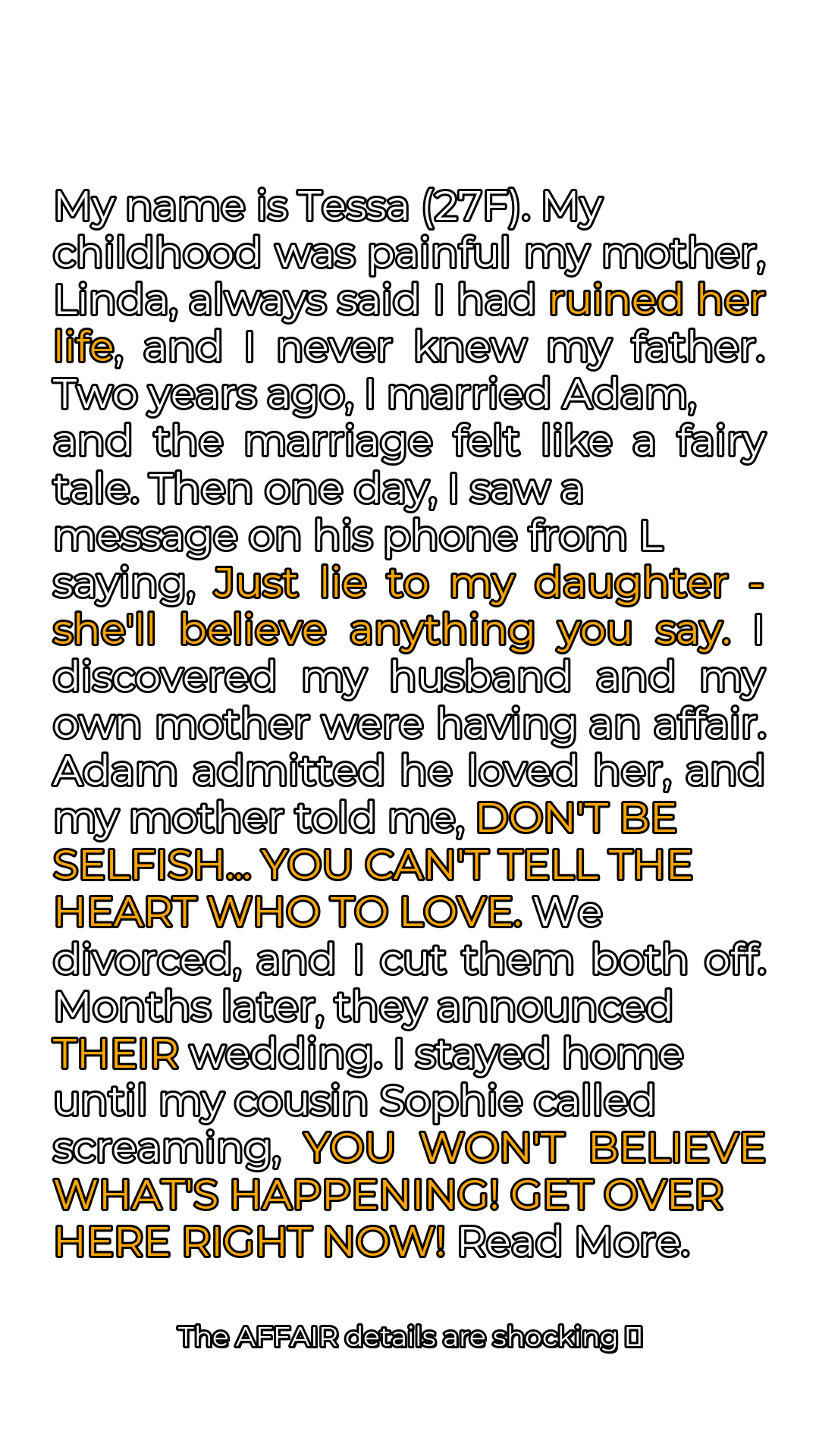 Adam claimed he loved her, and when I confronted my mother, her words were even more callous. She actually said, **”DON’T BE SELFISH… YOU CAN’T TELL THE HEART WHO TO LOVE.”** I was devastated. The two people who were supposed to care for me had conspired to destroy my life. My world crumbled around me as I grappled with the magnitude of their betrayal. The pain was unbearable, a constant, gnawing ache that threatened to consume me entirely.
