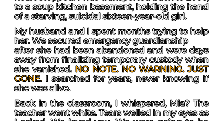 We were three days away from finalizing temporary custody when she disappeared. No note. No warning. Just gone. I searched shelters. Hospitals. Police records. For years. I never stopped wondering whether she was alive. Back in the classroom, I kept holding the teacher’s hand.