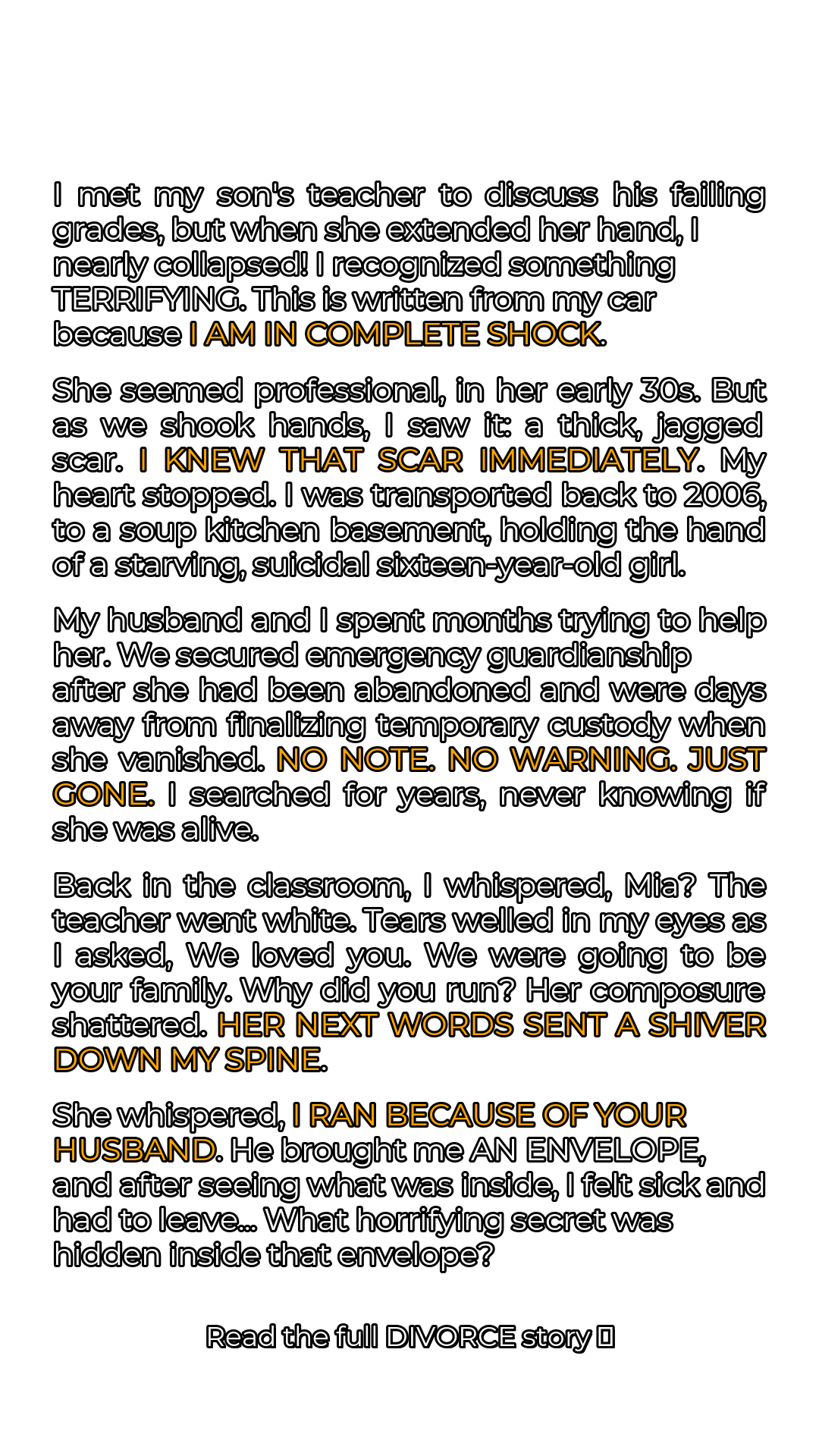 I met with my son’s math teacher to go over his grades — when she extended her hand, my knees gave out at the sight of her palm. This is being written from my car in the school parking lot because my hands won’t stop trembling. My son, Kyle, has been having a hard time since my divorce six months ago. His grades slipped. He stopped sleeping. So I arranged a meeting with his new math teacher, Ms. Miller. She seemed composed. Professional. In her early 30s. Her voice was soft. We discussed fractions and his attention span. Then the meeting wrapped up. She rose and offered a polite smile. “Thank you for coming in, Mrs. Harrison.” She reached out her hand.