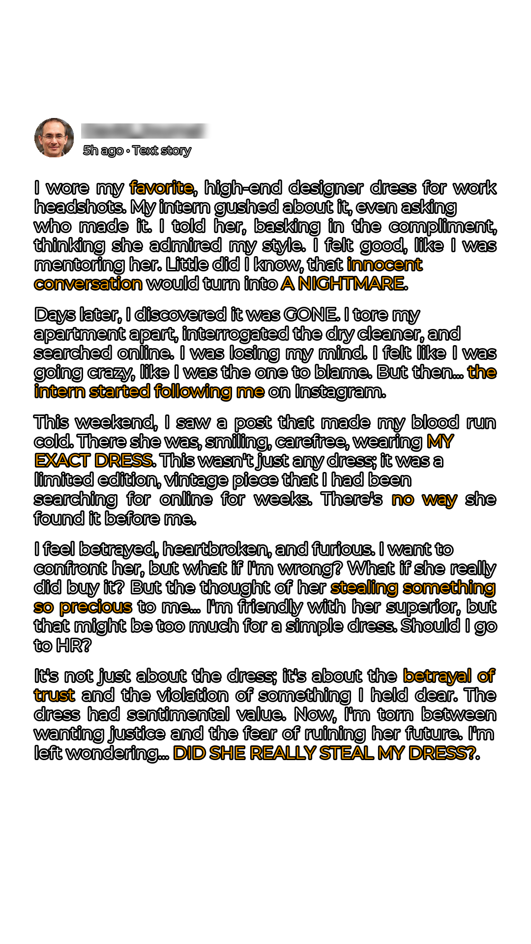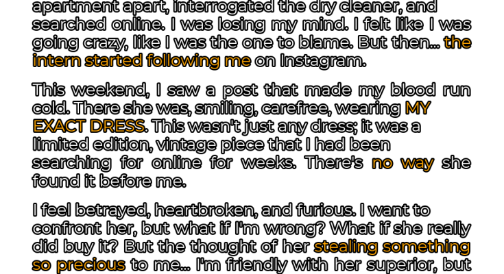 I asked nobody at work as I thought it would be offensive to even assume at my intimate studio of <40 ppl that anyone would deign to take another person's belongings. So I tore apart my closet. I interrogated my dry cleaner (*could i have dropped it off & forgotten? Could they have misplaced it?*). Eventually I gave up, accepting my own irresponsibility. I set search alerts on the RealReal, eBay etc. In the following weeks, the Intern is now asking me for creative advice on her projects, requested me on linkedin, and recently, started following me on IG and I followed back. I think she kinda looks up to me. But this weekend, I was shocked to see that she posted a picture of herself on her IG stories wearing my **exact** dress. Now, I know for a fact that this designer makes every collections in extremely limited runs and that it was part of a collaborative capsule collection from nearly 10 years ago. There aren't tons of them floating around the secondhand market. Even if there were, I have been checking everywhere on the internet religiously always keeping an eye out for my dress. Not to imply that I have my eye on every used designer store in America, but this is not the kind of dress that one would stumble upon frequently and given that I am a savvier shopper with more expendable income than this intern, if both of us were making an effort to find this dress on the internet at the same time, I swear to GOD I would have found & purchased it first. Now I very much want to delicately confront her about it. it would put my mind at ease to see a reciept to know that she went and sought out my dress for herself, that she's just a little copycat & not a thief. If she took it I'd ask for it back and keep it between us. I'm friendly with her superior and could say something to him too, or to be safe just go to HR to keep it 100% kosher, but tbh to me that feels extreme. What if it cost her her internship? And if she didn't steal my dress after all, it would REALLY embarrass me, not just her. Am I petty? Sure. But if justice for The Dress is possible, I want it. It sounds silly but it had sentimental value to me, not just material.