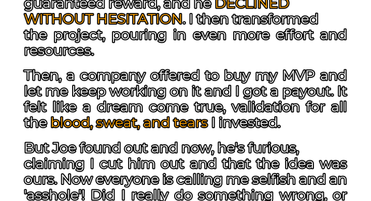 I told him I gave him the opportunity to stay involved. He declined. I said I did 100% of the additional work, and spent hours of my time and a lot of my money on it (to make this post as truthful as possible, I exaggerated that point). I also feel I should add, “Joe” isn’t very popular in my school, and tends to get made fun of. When we originally won that couple thousand euro, people in my school were giving him a hard time about freeloading, which I may have indirectly caused. I was complaining to friends about the two way split and it led to him getting outcast ever further. Now, when I sold the idea myself, people are saying that I’m selfish and, for lack of a better word, an ‘**asshole**’.