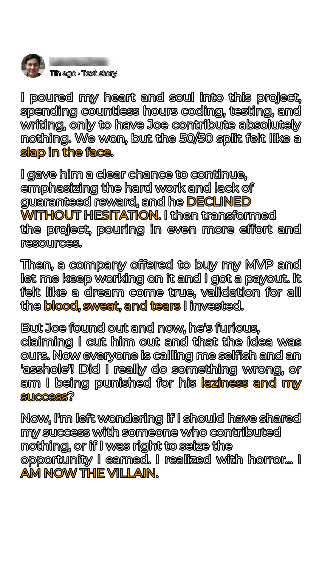 I (17M) had this idea for a project which I wanted to work on for a competition. My science teacher told me to include “Joe” (17M) because she thought he could help. I built the idea in a month; it was hard work and I felt very connected to it. At the beginning we talked about working together, but I did all the coding, testing, and writing. He showed up but didn’t contribute anything. When we won a couple thousand euros, split 50/50, I felt frustrated. I complained to friends, who said I shouldn’t do anything. Basically, I wasn’t happy, but I didn’t make a scene. During that time, I wanted to keep working on the project, but was fed up with “Joe” for not doing anything at all (*truthfully nothing*). I sent “Joe” a message asking if he wanted to keep working on the project.