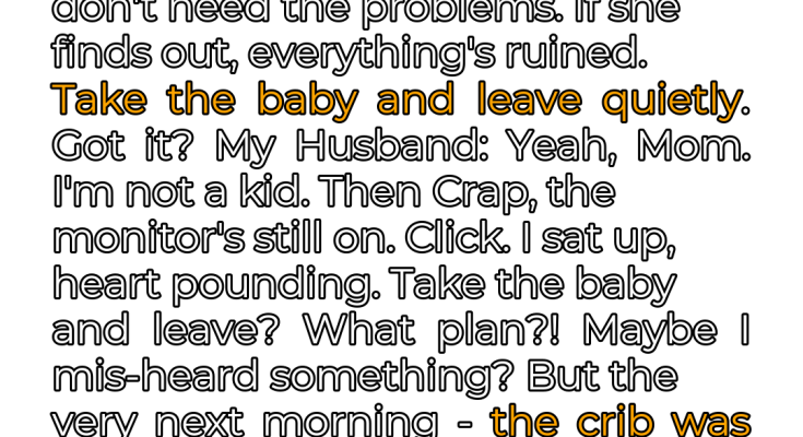 The electronic crackle of the baby monitor usually brought a sense of comfort, a subtle reminder that my precious child was sleeping soundly nearby. But tonight, it delivered a chilling revelation that ripped through my carefully constructed reality. I was half-asleep when I heard my MIL’s voice, a low, conspiratorial whisper that immediately set my nerves on edge: “You didn’t tell her, right?” My husband’s response, a carefully casual “No. Of course not,” did nothing to quell my rising anxiety. There was an undercurrent of something hidden, a secret carefully guarded. My heart began to pound in my chest, a frantic drumbeat against the silence of the night. Then came the words that would forever be etched into my memory, spoken with a chilling indifference that made my blood run cold: “Good. Be careful. We don’t need the problems. If she finds out, everything’s ruined. Take the baby and leave quietly. Got it?”