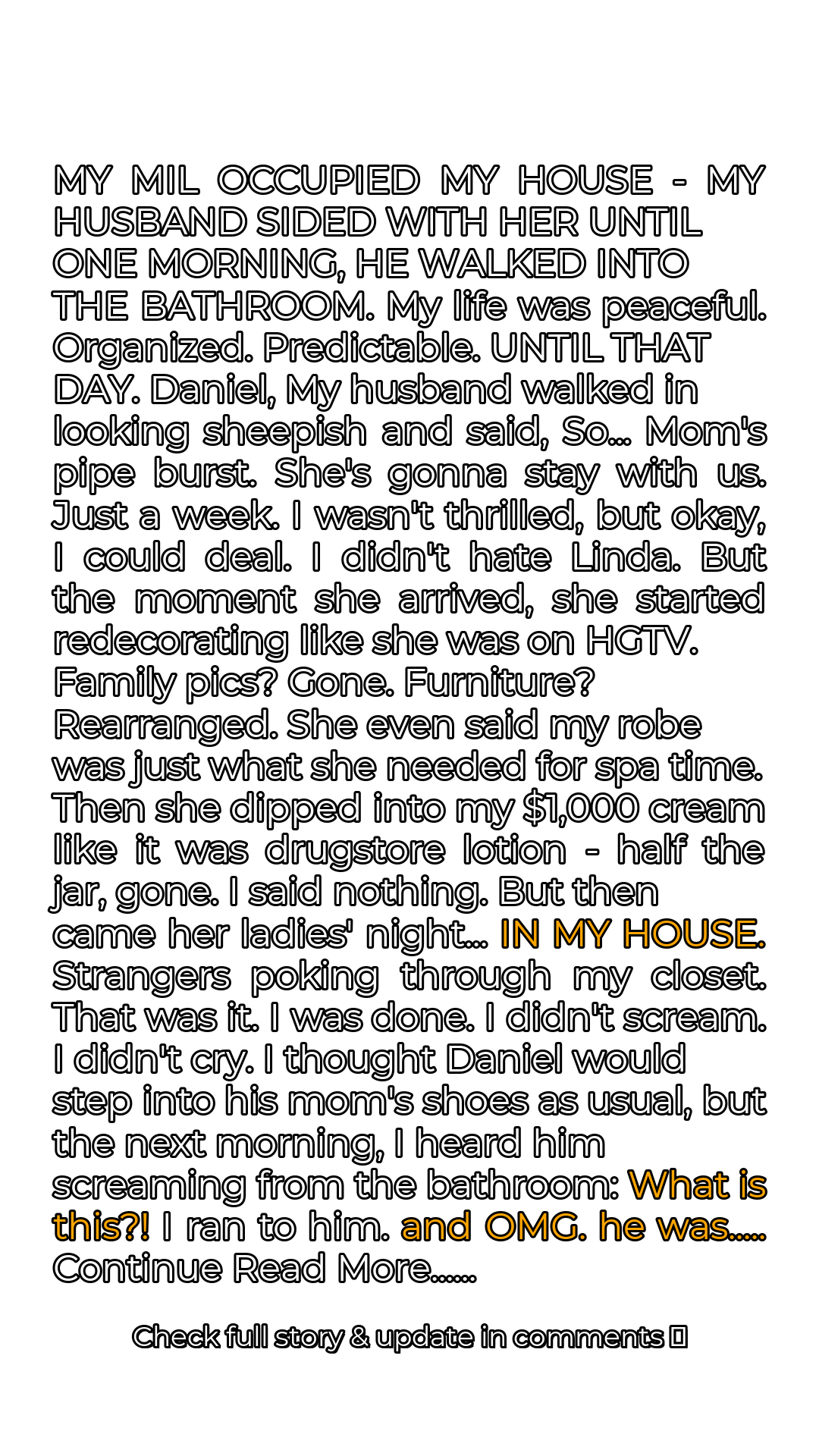 I fully expected Daniel to continue his pattern of appeasing his mother, dismissing my concerns as trivial. But the next morning, a bloodcurdling scream shattered the morning calm. It came from the bathroom, Daniel’s voice filled with a mixture of shock and disbelief: **”WHAT IS THIS?!”** My heart leaped into my throat. I ran towards the bathroom, fear gnawing at me like a rabid animal. What had happened? Had Linda fallen? Had there been an accident?
