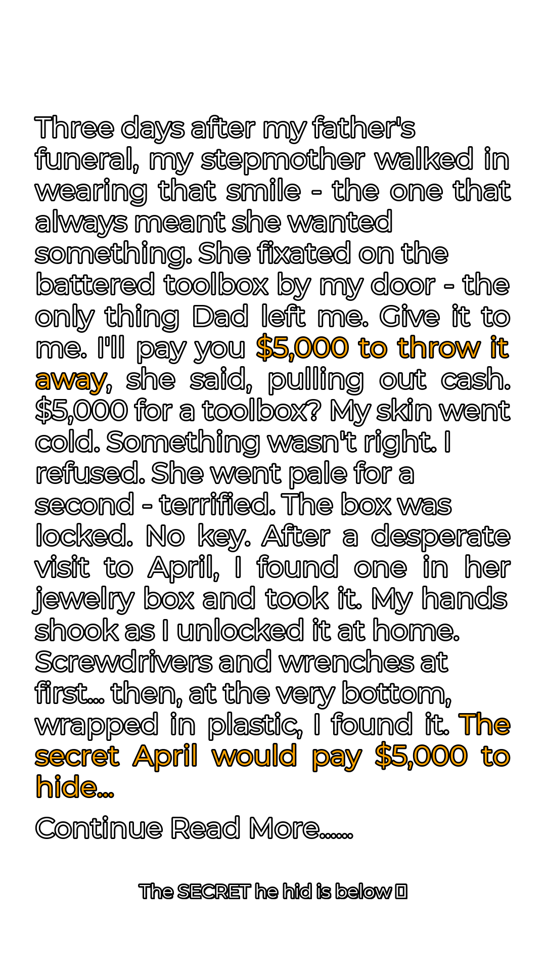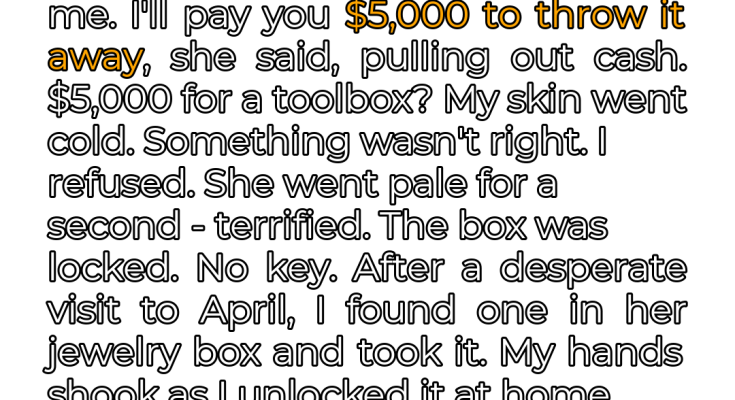 Three days after we laid Dad to rest, my stepmother, April, showed up at the house. She had that sickeningly sweet smile plastered on her face, the one that always meant she wanted something, usually at my expense. Her eyes immediately fixated on Dad’s old, battered toolbox sitting by the door. It was the only thing he had left me, a tangible piece of him in this now empty house. She might as well asked for my heart to be ripped out. “Give it to me,” she said, her voice a little too high-pitched, a little too casual. Then came the offer, the one that made my blood run cold. “I’ll pay you $5,000 to throw it away.” Five thousand dollars? For a toolbox filled with rusty tools he used every single day? It didn’t make sense. My mind raced, trying to understand. This wasn’t about the toolbox itself; this was about something hidden inside, something she desperately wanted GONE, something that would make her richer.