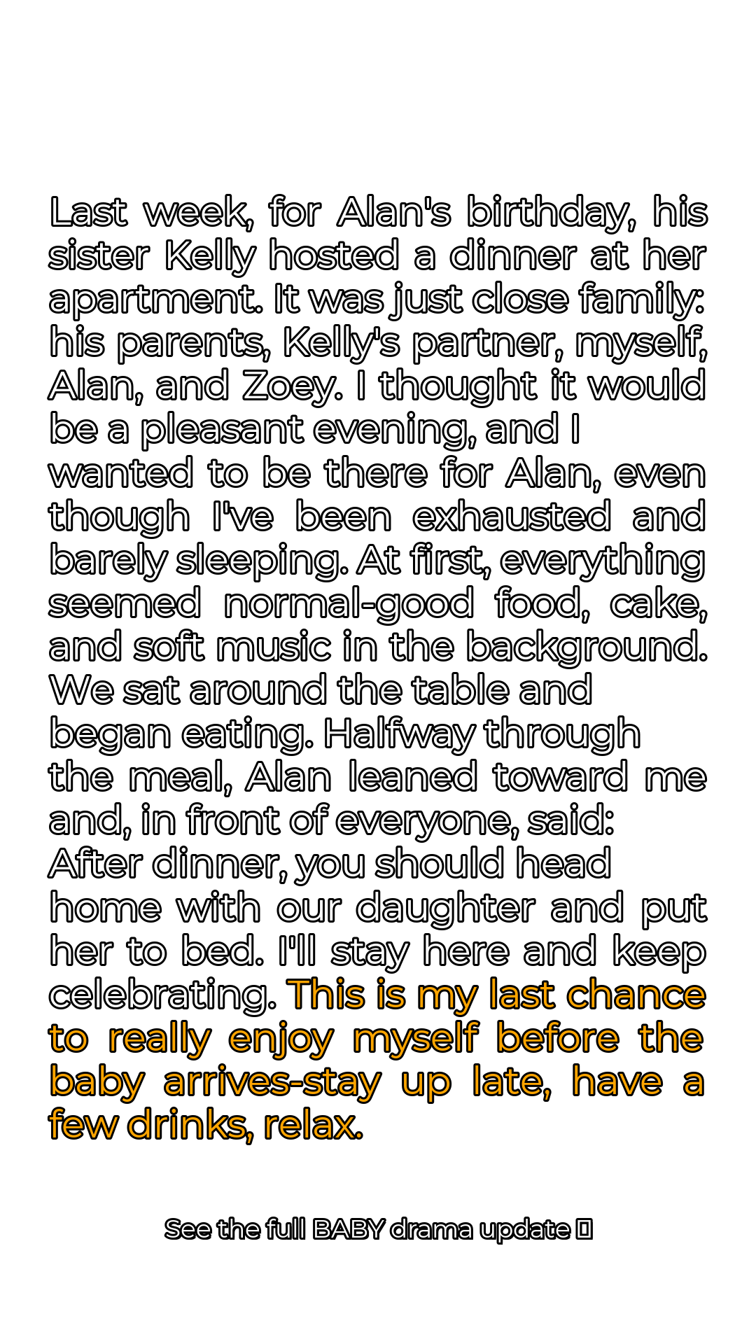 My heart skipped a beat. I couldn’t comprehend where he was going with this. Before I could process his statement, he continued, his voice laced with an unsettling indifference. “I’ll stay here and keep celebrating. This is my last chance to really enjoy myself before the baby arrives—stay up late, have a few drinks, relax.” The room seemed to spin around me, the sounds of laughter and conversation fading into a distant hum. I felt a cold dread creep into my chest.