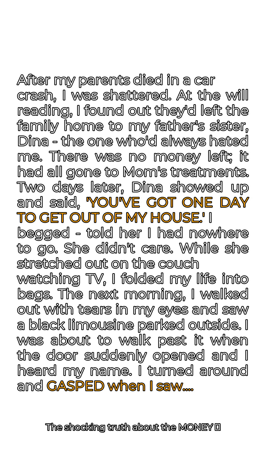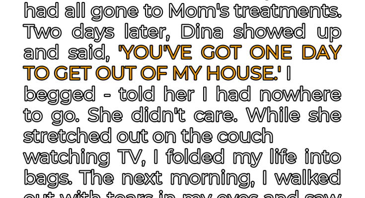 Two days later, Dina arrived, her presence filling the house with a palpable sense of dread. She surveyed the scene with a cold, calculating gaze, her eyes devoid of any sympathy or compassion. Without a word of greeting, she delivered her ultimatum: “You’ve got one day to get out of my house.” Her voice was sharp, each syllable laced with a venom that sent shivers down my spine. I pleaded with her, my voice cracking with desperation, explaining that I had nowhere to go, no family to turn to, no resources to fall back on. My parents were dead, and now my only relative was kicking me out.