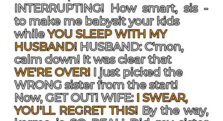 Mark, ever the charmer, had the audacity to act as if I were overreacting. “C’mon, calm down!” he said, as if walking in on your husband and sister in bed was a minor inconvenience. As if that was not enough, he had the gall to say “It was clear that we’re over!” The words were like a physical blow, each syllable crushing another piece of my heart. He continued, “I just picked the wrong sister from the start! Now, GET OUT!” His confession was a twisted justification, as if choosing between sisters was as simple as picking a flavor of ice cream. The utter lack of remorse in his eyes fueled my rage.