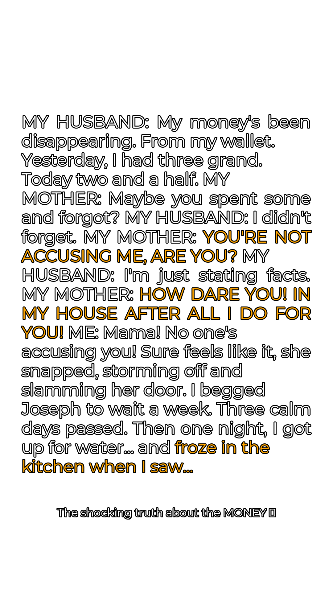 My mother’s reaction was volcanic. “YOU’RE NOT ACCUSING ME, ARE YOU?” she shrieked, her face contorted with a mixture of outrage and something that looked suspiciously like fear. Joseph, to his credit, remained relatively calm, though I could see the anger simmering beneath the surface. “I’m just stating facts,” he replied, his voice even. The air crackled with animosity, thick and suffocating. “HOW DARE YOU! IN MY HOUSE AFTER ALL I DO FOR YOU!” my mother continued, her voice rising in pitch. The hypocrisy stung. It was *our* house, not hers, and we had welcomed her in.