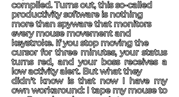 The mechanics of the spyware were laughably Orwellian: if you stop moving the cursor for three minutes, your status turns red, and your boss receives a “low activity” alert. It was as if they expected me to be a tireless machine, devoid of human needs or moments of contemplation. The sheer absurdity of it fueled my resolve to fight back. I refused to be reduced to a data point in their surveillance system.