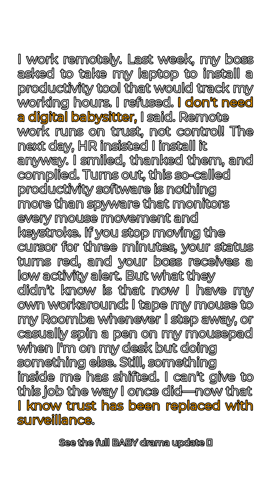 The next day, HR cornered me. They were all smiles and polite insistence, but their message was clear: install the software, or face the consequences. I felt trapped. I smiled, thanked them, and complied, but inside, a storm was brewing. I couldn’t shake the feeling of being watched, scrutinized, and ultimately, mistrusted. It was as if a spotlight had been shone on my every action, amplifying my insecurities and anxieties.