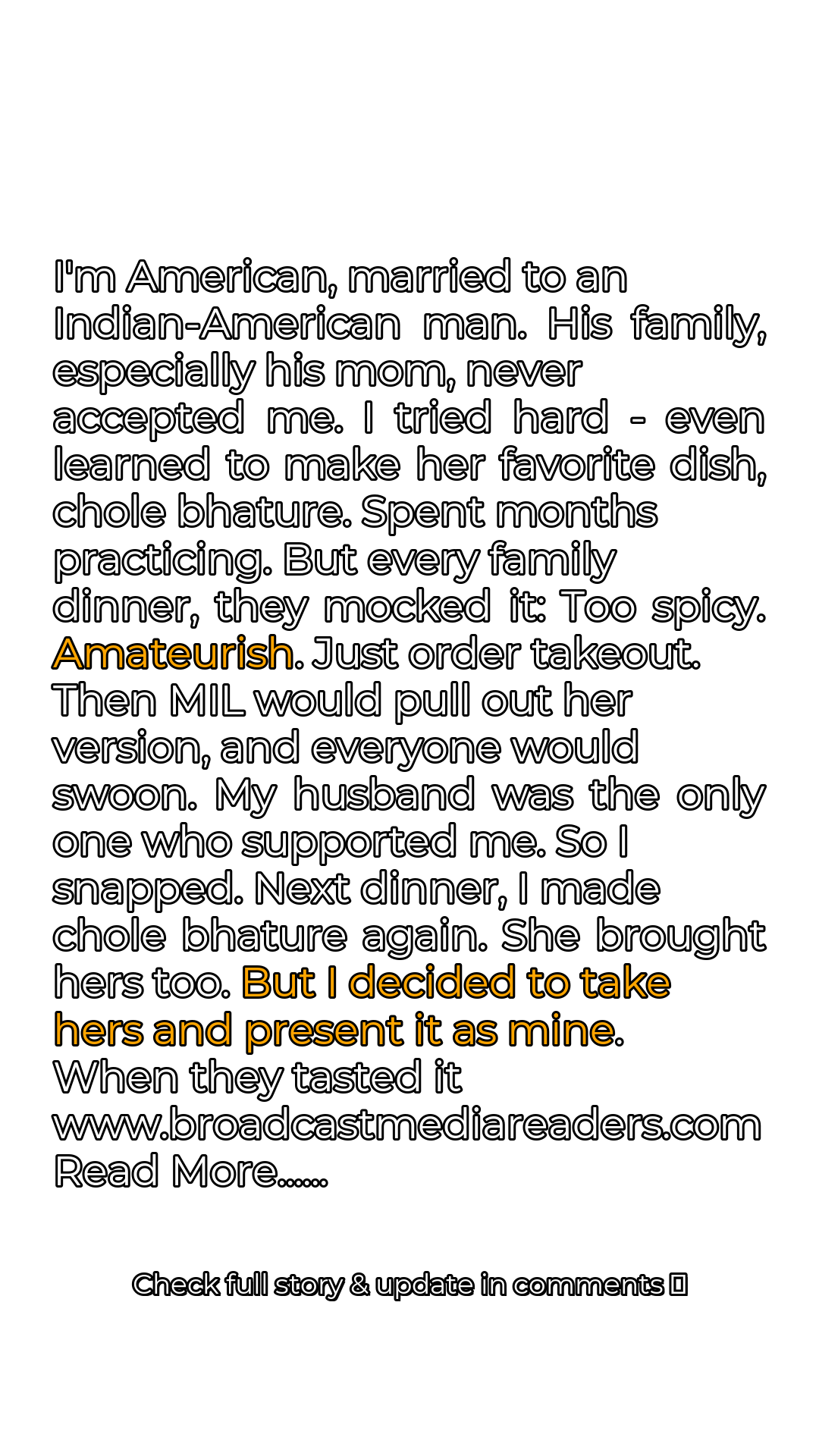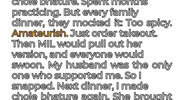 I’m an American woman married to an Indian-American man. From the moment we got engaged, his family, particularly his mother, made it abundantly clear that I wasn’t their first choice—or even their tenth. I was an outsider, a foreigner, and no matter how hard I tried, I couldn’t seem to bridge the cultural gap. Their disapproval hung over me like a dark cloud, casting a shadow on what should have been a joyful union. Desperate to earn their acceptance, I decided to tackle what seemed to be the key to their hearts: their stomachs. My mother-in-law’s chole bhature was legendary, a dish that evoked nostalgic memories and represented the pinnacle of culinary perfection in their eyes. So, I embarked on a culinary quest, determined to master the art of making this beloved dish. For months, I toiled in the kitchen, poring over recipes, watching countless videos, and experimenting with different spices and techniques. The aroma of chickpeas and fried bread filled our apartment as I tirelessly practiced, hoping to replicate the magic of my mother-in-law’s creation. I asked her for advice, but she was very vague.