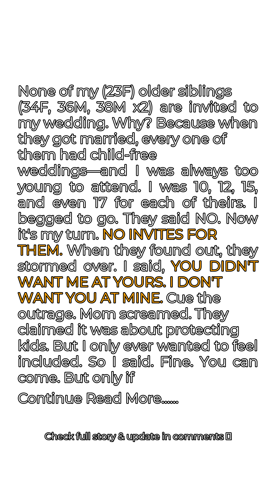 I told them about all the times I had been left out, about the pain and disappointment I had felt. I reminded them of their unwavering stance on child-free weddings, their justifications, and their dismissals. I recounted the countless hours I spent alone in my room, feeling like an outsider. I didn’t expect them to understand or even to apologize. I simply wanted them to acknowledge the impact of their choices. My sisters and brothers stood in silence, their faces a mix of anger and confusion. I knew they were missing the point.