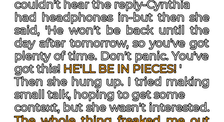 I leaned in, desperately trying to catch the other end of the conversation, but Cynthia was wearing headphones. All I could hear was her side of this **horrifying exchange**. “He won’t be back until the day after tomorrow, so you’ve got plenty of time. Don’t panic. You’ve got this!” A wave of nausea washed over me as I struggled to make sense of her words. What ‘time’? Time for what? The dread was building with each passing second, a suffocating weight pressing down on my chest.