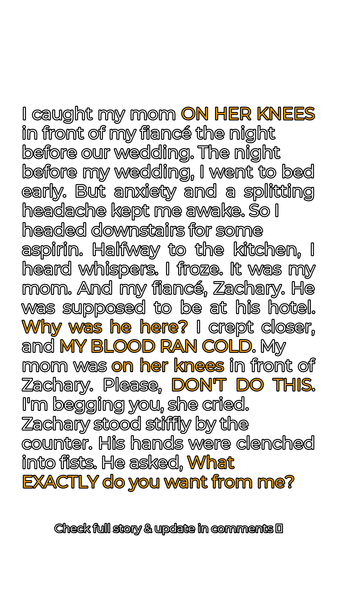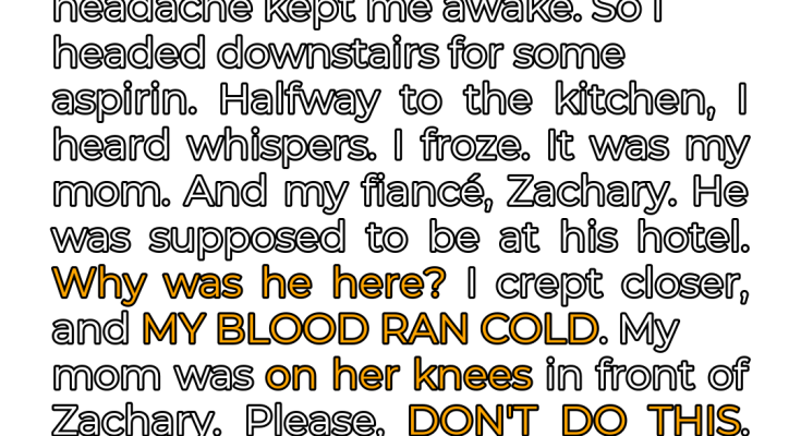 The night before my wedding was supposed to be filled with excitement and anticipation. Instead, it became the night my world crumbled around me. A splitting headache and a nagging sense of anxiety had kept me tossing and turning in bed. Finally, I decided to get up and head downstairs for some aspirin, hoping it would ease the throbbing pain in my head. I never could have imagined the pain that awaited me. As I made my way down the creaky wooden stairs, I heard hushed whispers coming from the kitchen. I froze, my heart pounding in my chest. The voices were familiar, yet something about their tone sent a chill down my spine. It was my mom and… Zachary, my fiancé. He was supposed to be at his hotel, preparing for our big day. **What was he doing here, in our kitchen, in the middle of the night?** Curiosity and a growing sense of dread propelled me forward. I crept closer, my steps silent on the cold tile floor, trying to make out what they were saying.